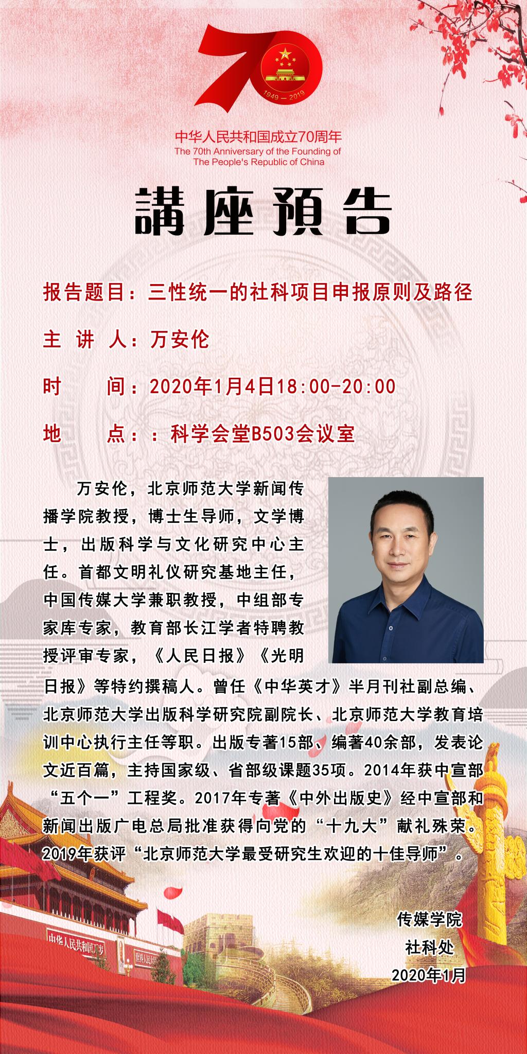 【预告】 北京师范大学新闻传播学院万安伦教授应传媒学院邀请来威尼斯官网作学术报告