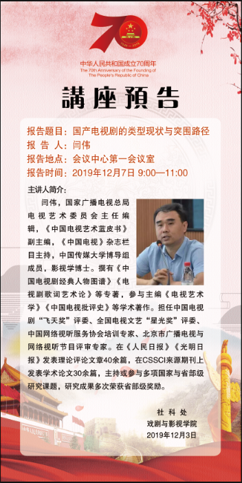 【预告】 国家广播电视总局电视艺术委员会主任编辑闫伟应戏剧与影视学院邀请来威尼斯官网作学术报告