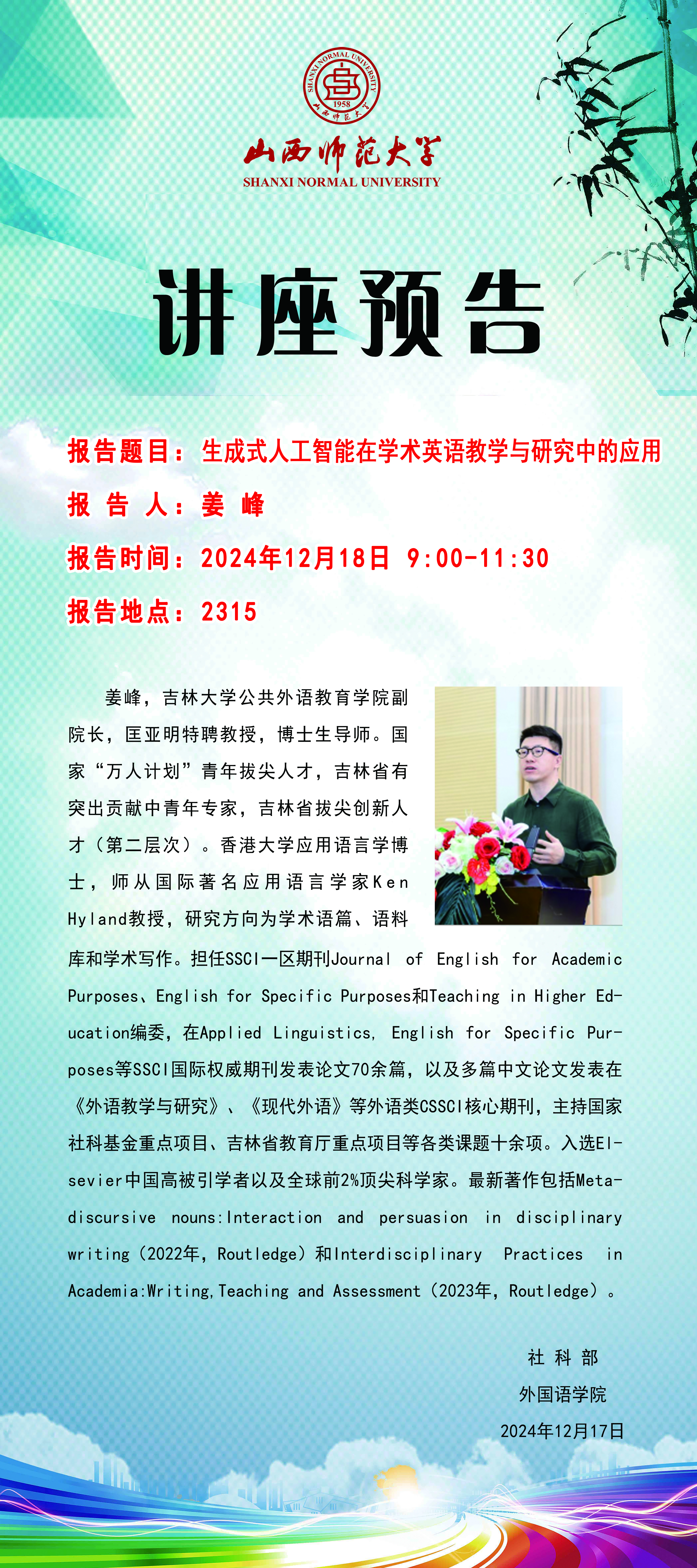 【预告】吉林大学姜峰教授应外国语学院邀请作学术讲座