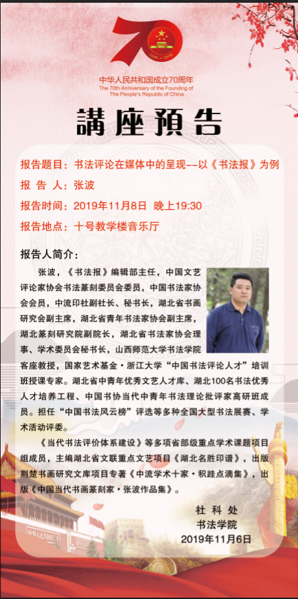 【预告】 《书法报》编辑部主任、中国书法家协会会员张波应书法学院邀请来威尼斯官网做学术报告