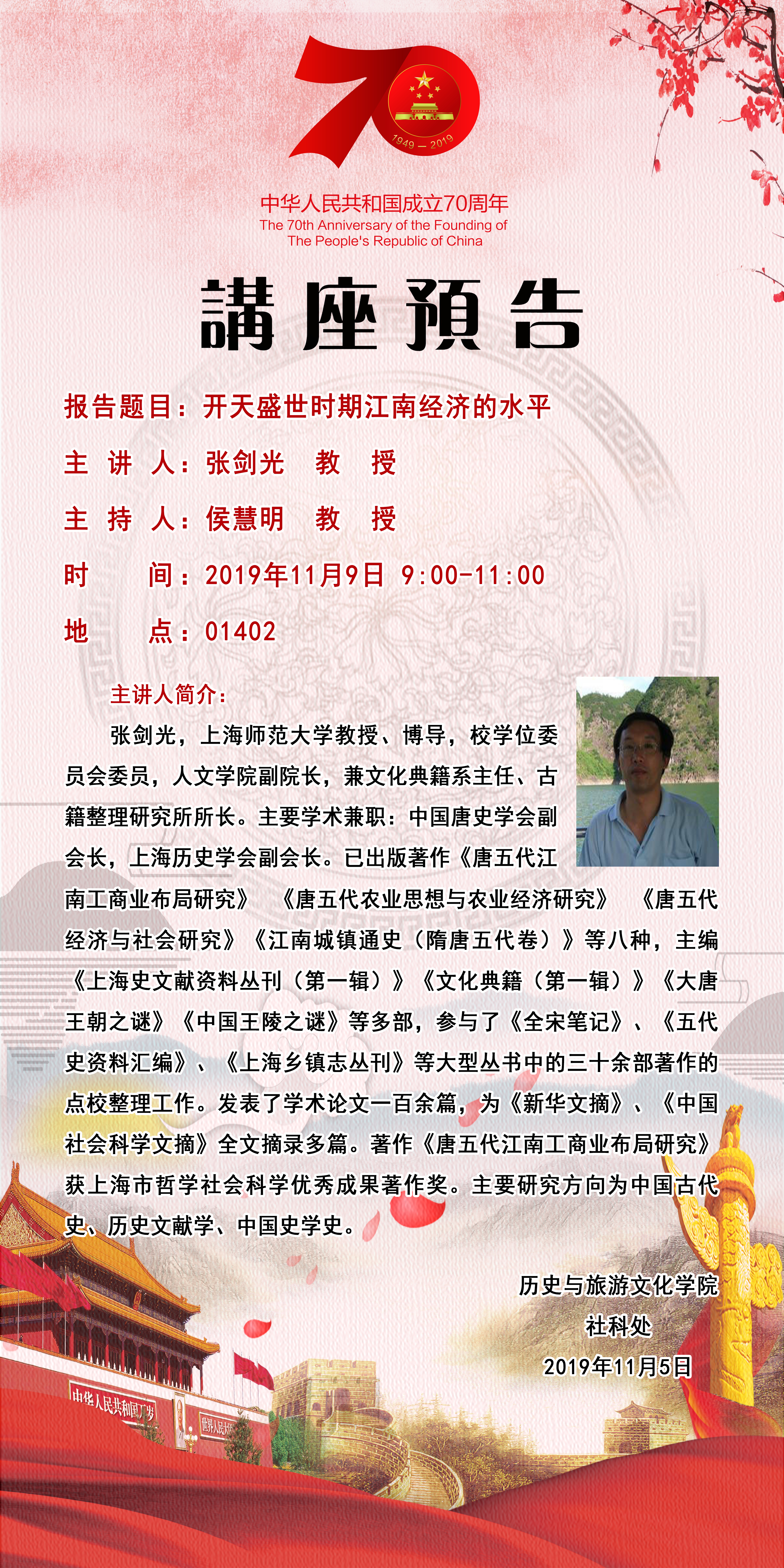 【预告】 上海师范大学张剑光教授应历史与旅游文化学院邀请来威尼斯官网作学术报告