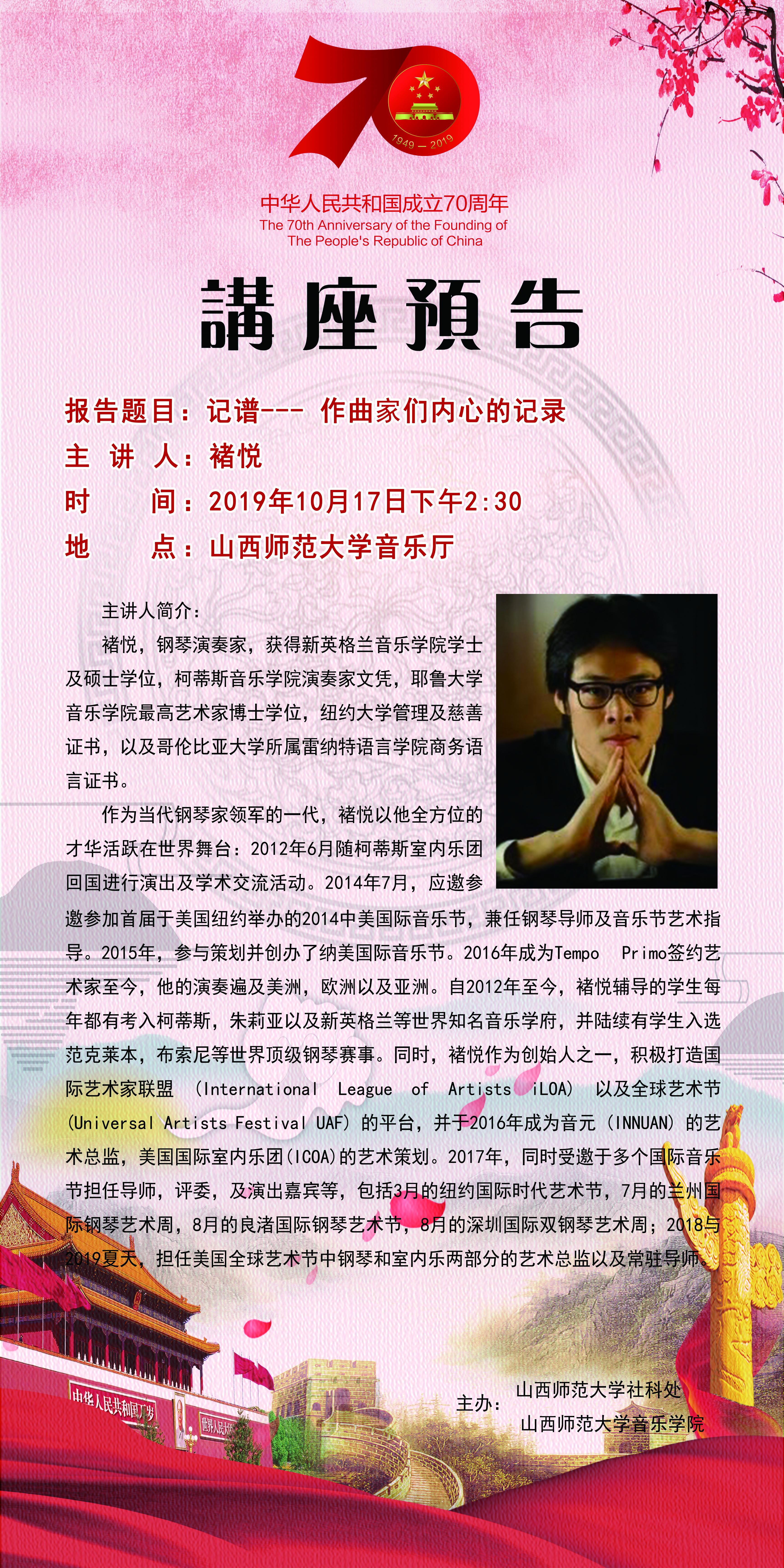 【预告】钢琴演奏家褚悦应音乐学院邀请来威尼斯官网作学术报告
