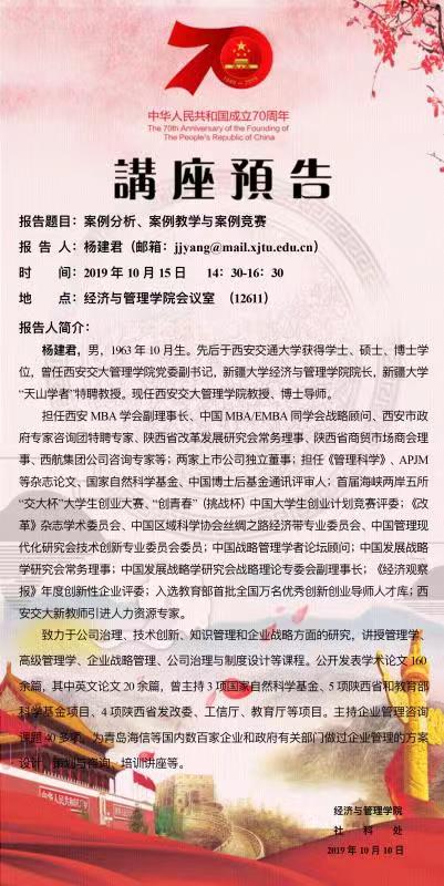 【预告】 西安交通大学杨建君教授应经济与管理学院邀请来威尼斯官网作学术报告