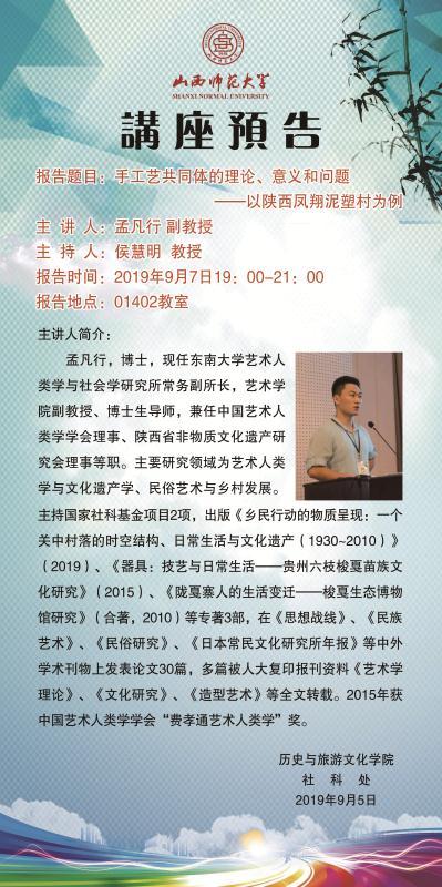 【预告】 东南大学孟凡行副教授应历史与旅游文化学院邀请来威尼斯官网作学术报告