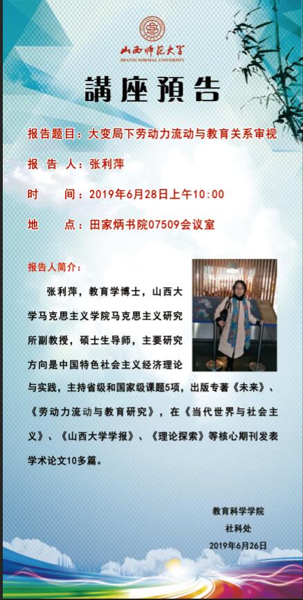 【预告】 山西大学张利萍教授应教育科学学院邀请来威尼斯官网作学术报告
