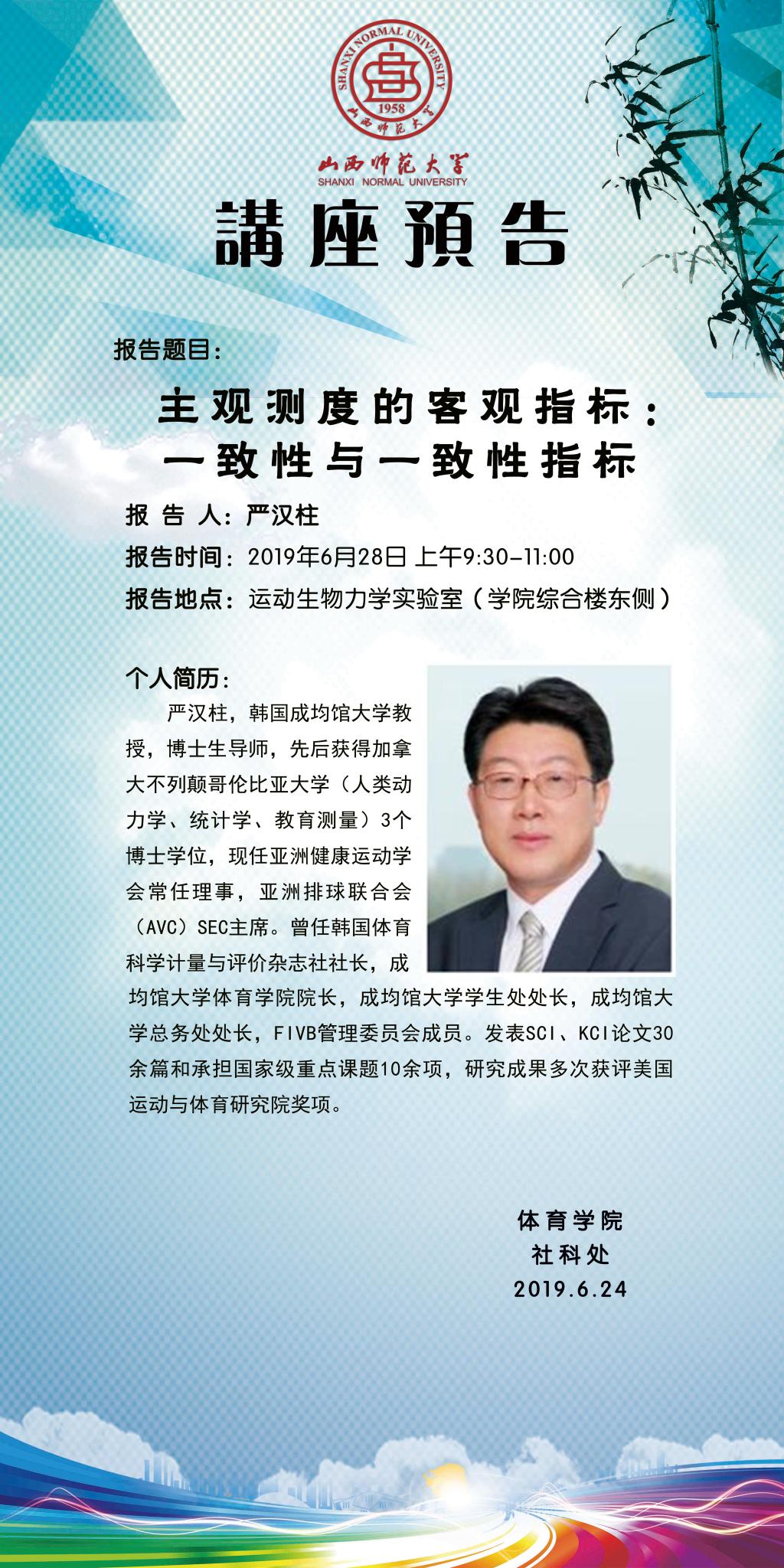 【预告】 韩国成均馆大学严汉柱教授应体育学院邀请来威尼斯官网作学术报告