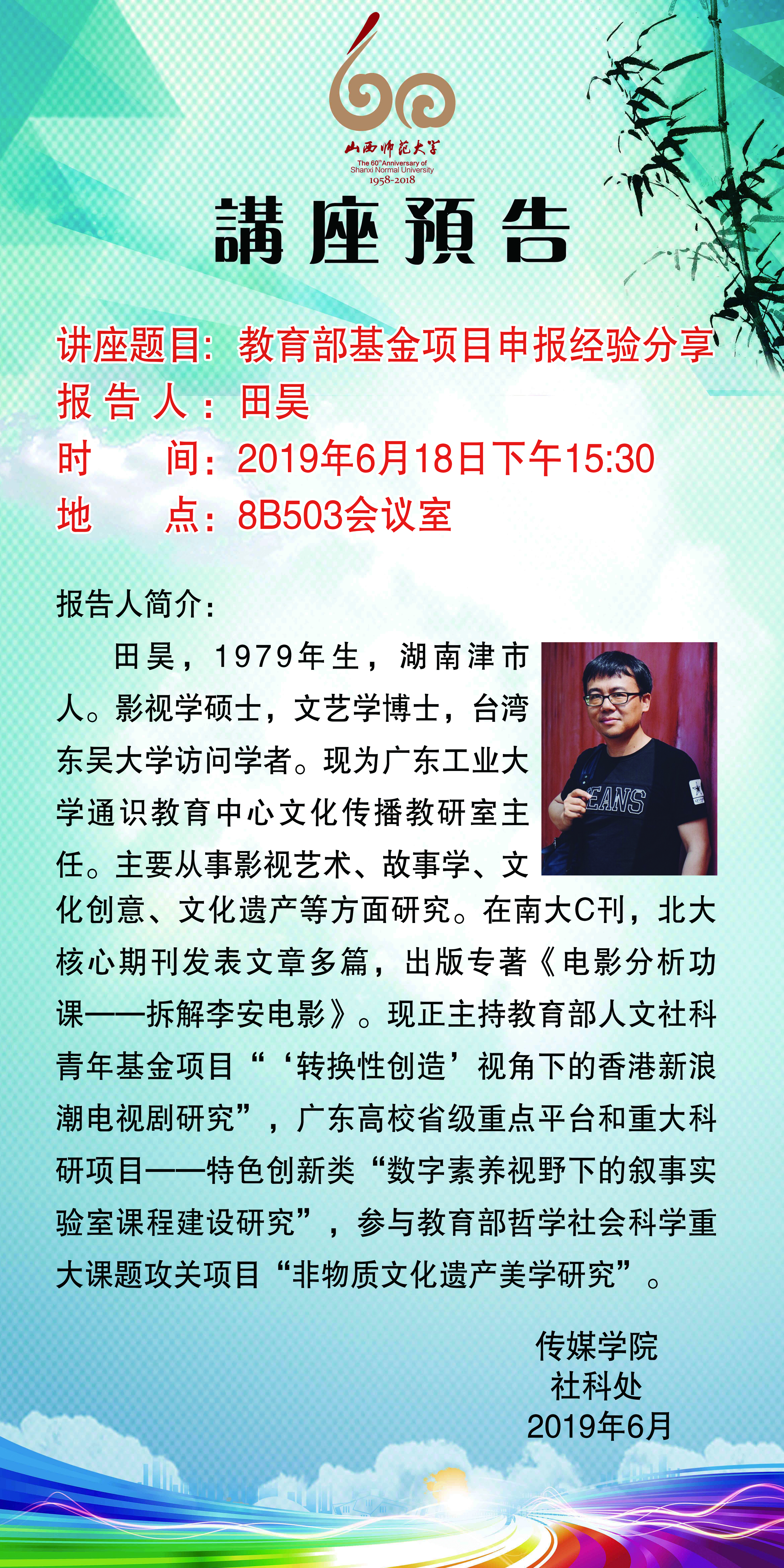【预告】 广东工业大学田昊老师应传媒学院邀请来威尼斯官网作学术报告