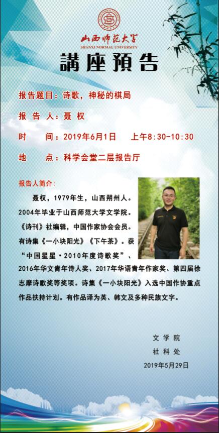 【预告】 中国作家协会会员、《诗刊》社聂权编辑应文学院邀请来威尼斯官网作学术报告