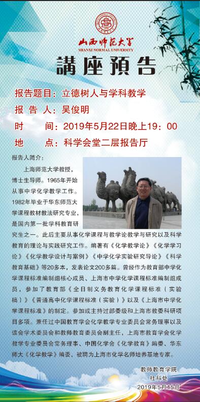 【预告】 上海师范大学吴俊明教授应教师教育学院邀请来威尼斯官网作学术报告