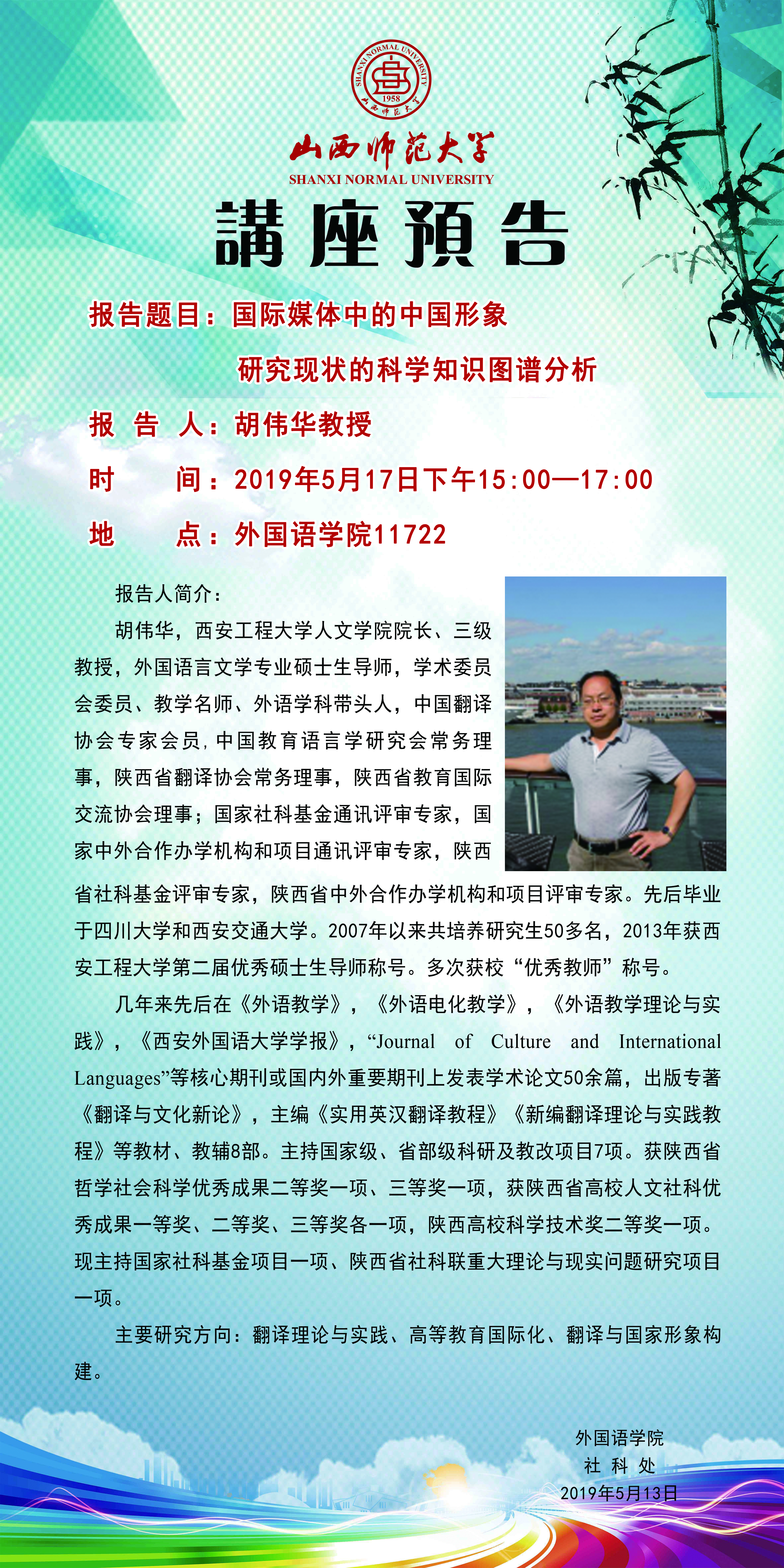 【预告】 西安工程大学胡伟华教授应外国语学院邀请来威尼斯官网作学术报告