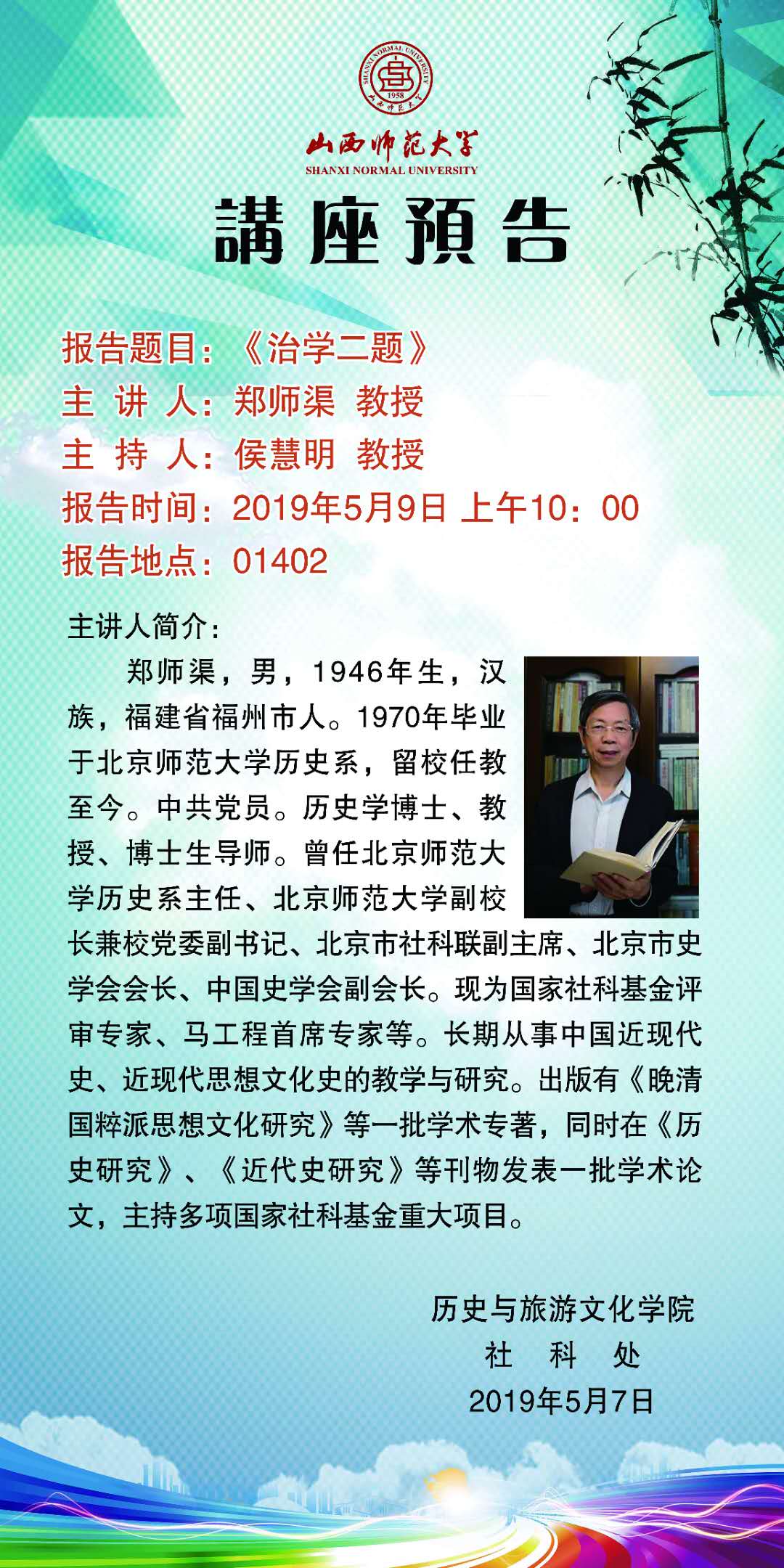 【预告】 北京师范大学郑师渠教授应历史与旅游文化学院邀请来威尼斯官网作学术报告