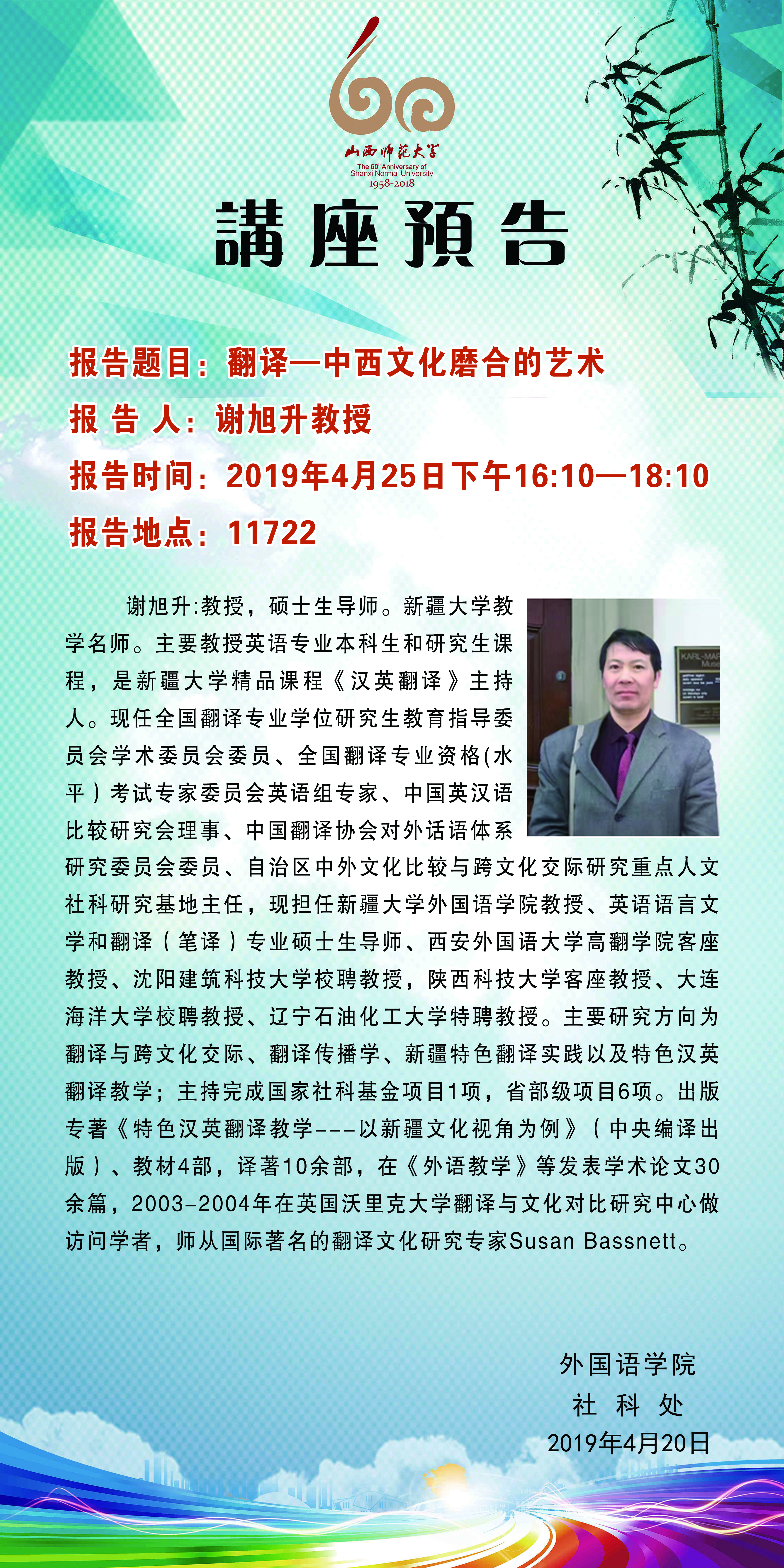 【预告】 新疆大学谢旭升教授应外国语学院邀请来威尼斯官网作学术报告
