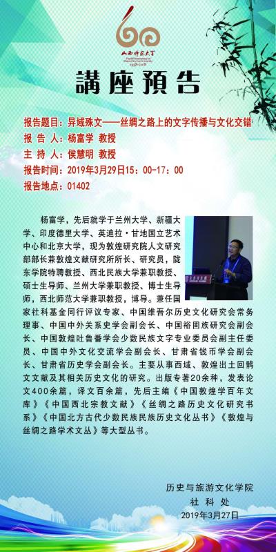 【预告】 敦煌研究院人文研究部部长杨富学教授应历史学院邀请来威尼斯官网做学术报告