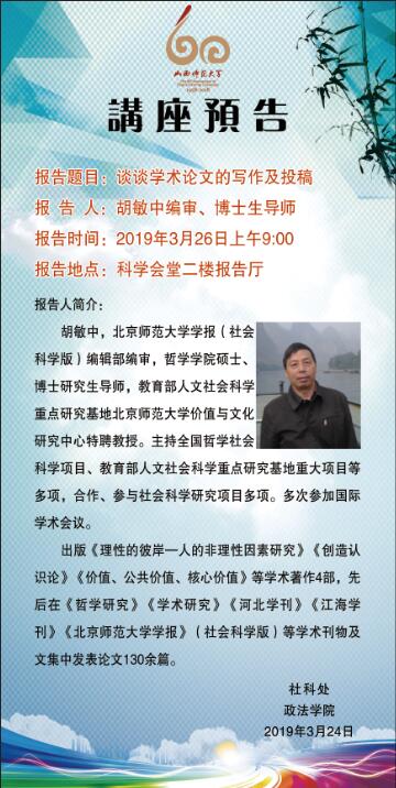 【预告】 北京师范大学学报(社会科学版)编辑部胡敏中编审应政法学院邀请在威尼斯官网作学术报告