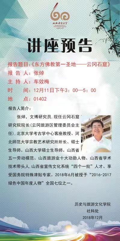 【预告】文博研究员,云冈石窟研究院院长张焯教授应历史与旅游文化学院邀请来威尼斯官网作学术报告