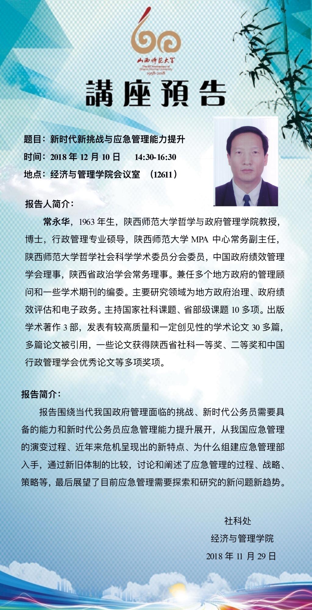 【预告】陕西师范大学哲学与政府管理学院常永华教授应经济与管理学院邀请来威尼斯官网作学术报告