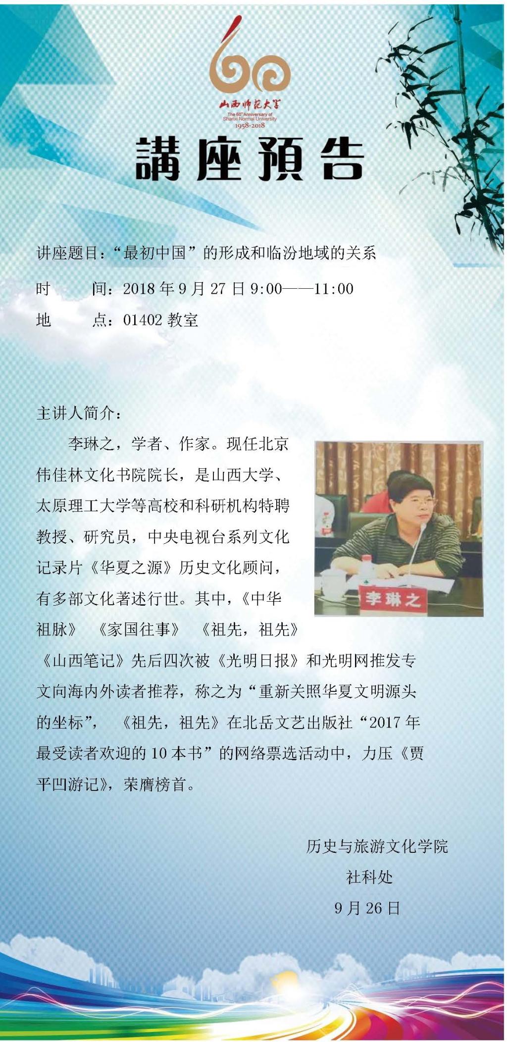 【预告】北京伟佳林文化书院院长李琳之教授应历史与旅游文化学院邀请来威尼斯官网做学术报告