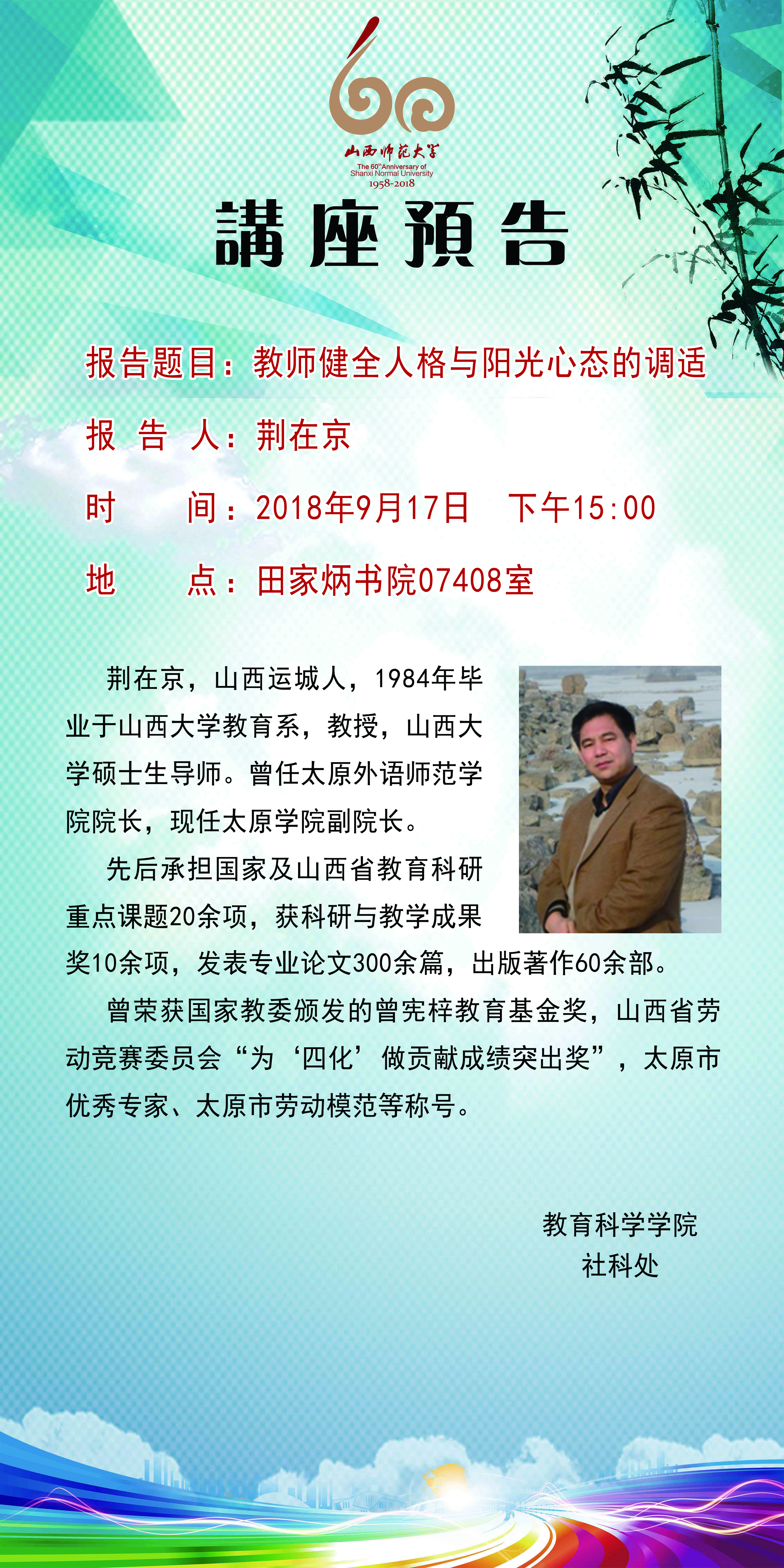 【预告】太原学院荆在京教授应教育科学学院邀请来威尼斯官网作学术报告