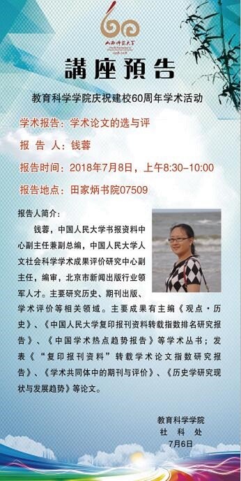 【预告】中国人民大学书报资料中心钱蓉副主任应教育科学学院邀请来威尼斯官网作学术报告