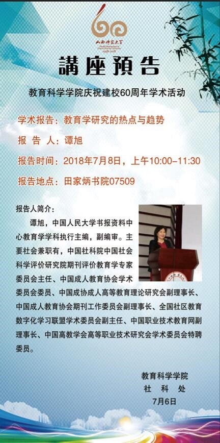 【预告】中国人民大学书报资料中心教育学学科谭旭主编应教育科学学院邀请来威尼斯官网作学术报告