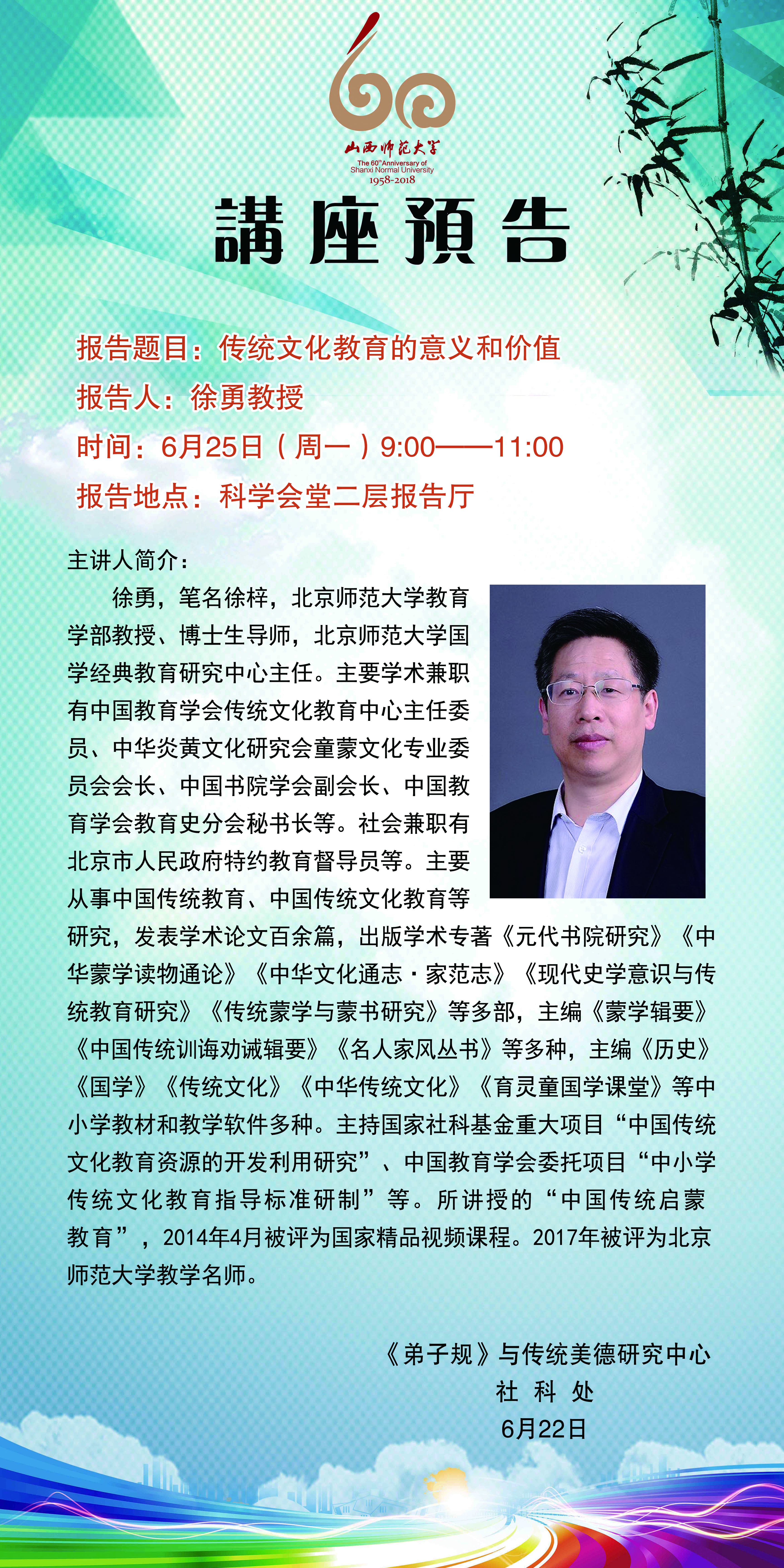 【预告】北京师范大学教育学院徐勇教授应《弟子规》与传统美德研究中心邀请来威尼斯官网作学术报告