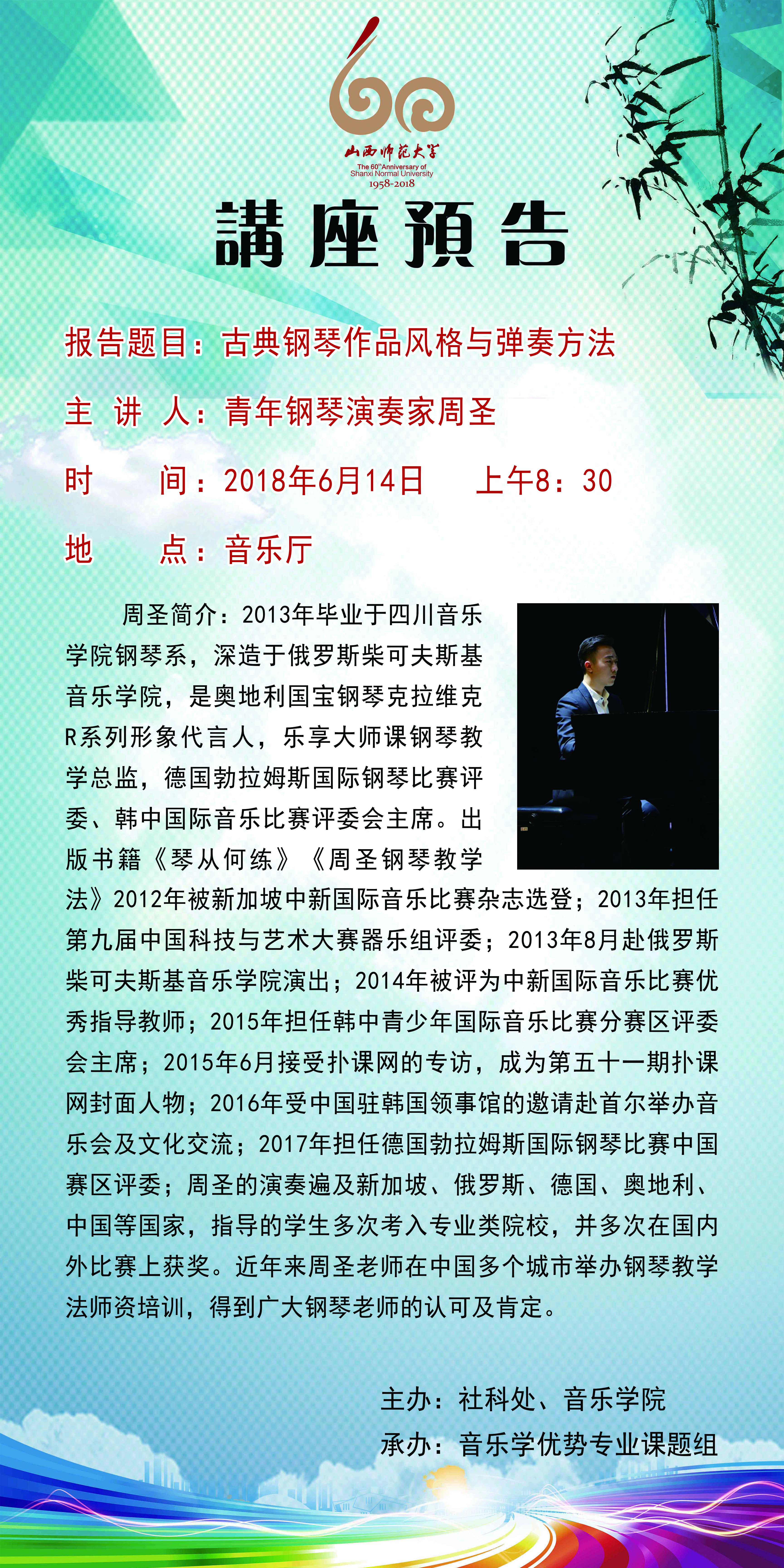 【预告】青年钢琴演奏家周圣老师应音乐学院邀请来威尼斯官网作学术报告
