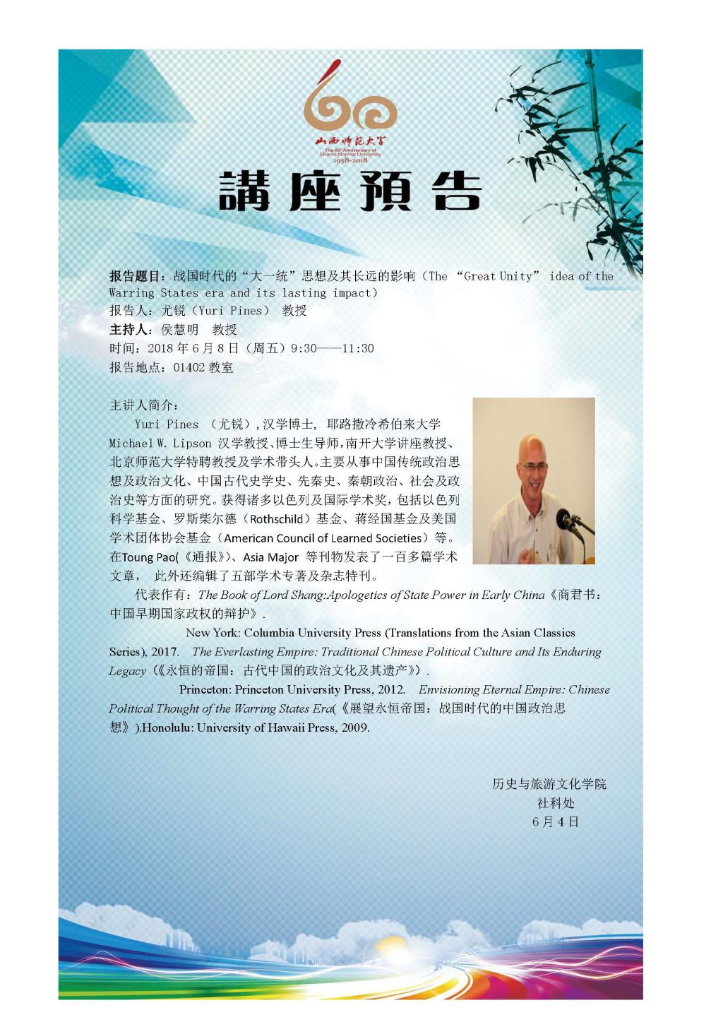 【预告】耶路撒冷希伯来大学尤锐(Yuri Pines)教授应历史与旅游文化学院邀请来威尼斯官网作学术报告