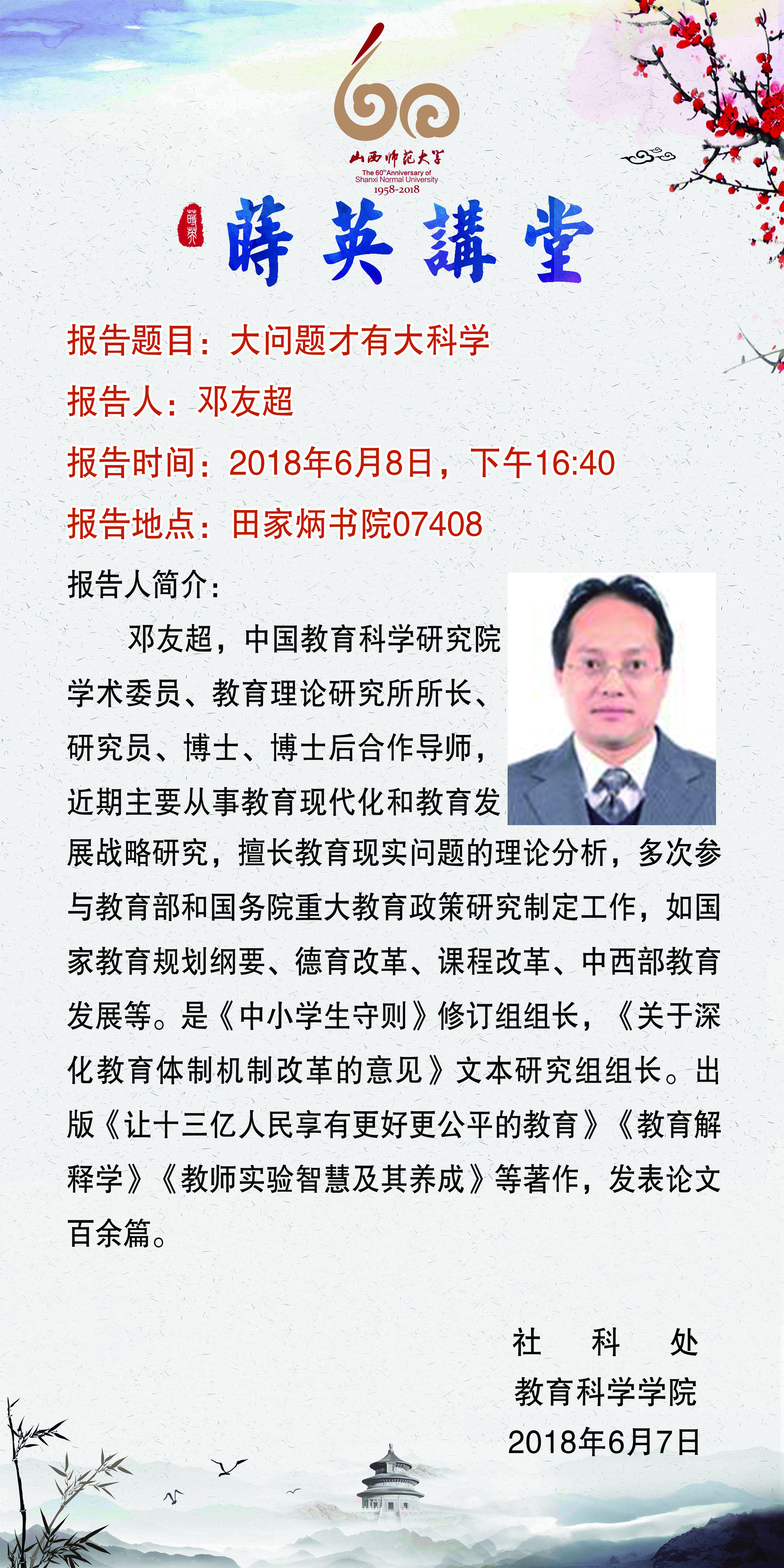 【预告】【莳英讲堂】中国教育科学研究院理论所所长邓友超教授应教育科学学院邀请来威尼斯官网作学术报告