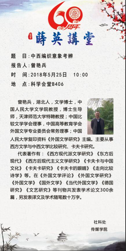 【预告】【莳英讲堂】中国人民大学曾艳兵教授应传媒学院邀请来威尼斯官网作学术报告
