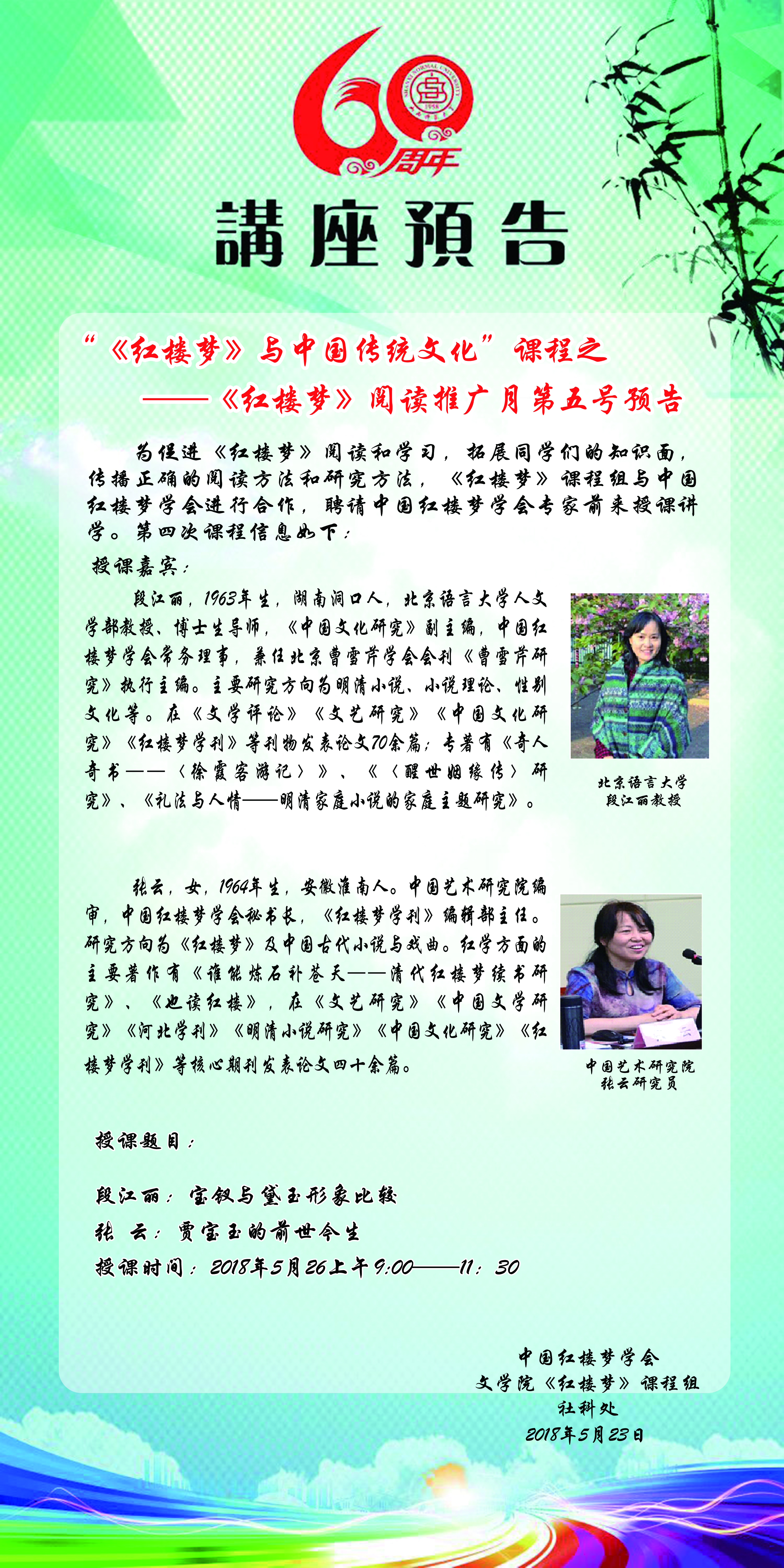 【预告】中国艺术研究院张云研究员、北京语言大学段江丽教授应文学院《红楼梦》课题组邀请来威尼斯官网作学术报告