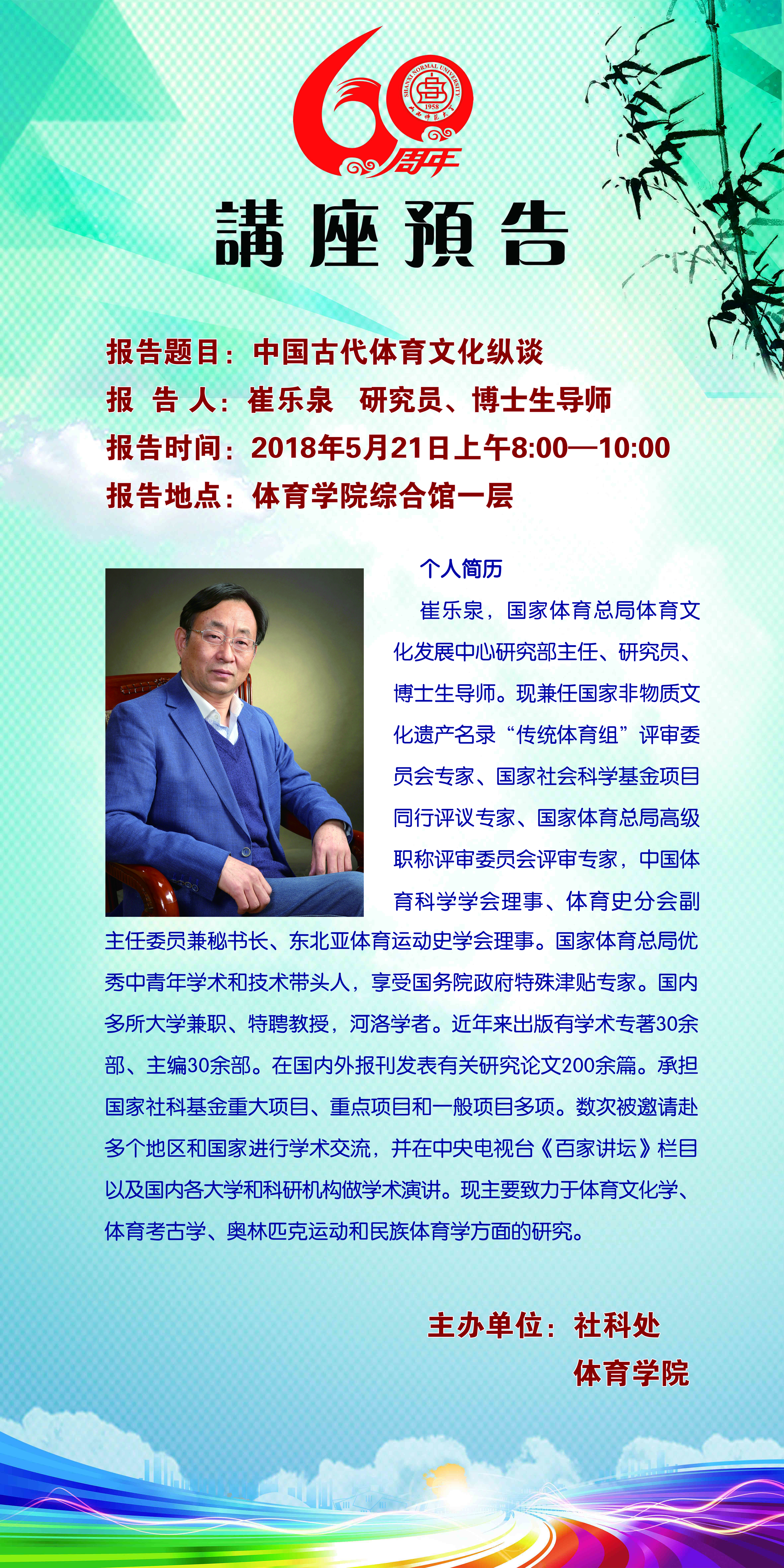 【预告】国家体育总局体育文化发展中心研究部主任崔乐泉研究员应体育学院邀请来威尼斯官网作学术报告.
