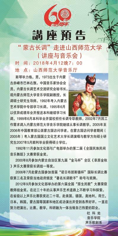 【预告】内蒙古长调艺术交流研究会斯琴毕力格秘书长应音乐学院邀请来威尼斯官网交流