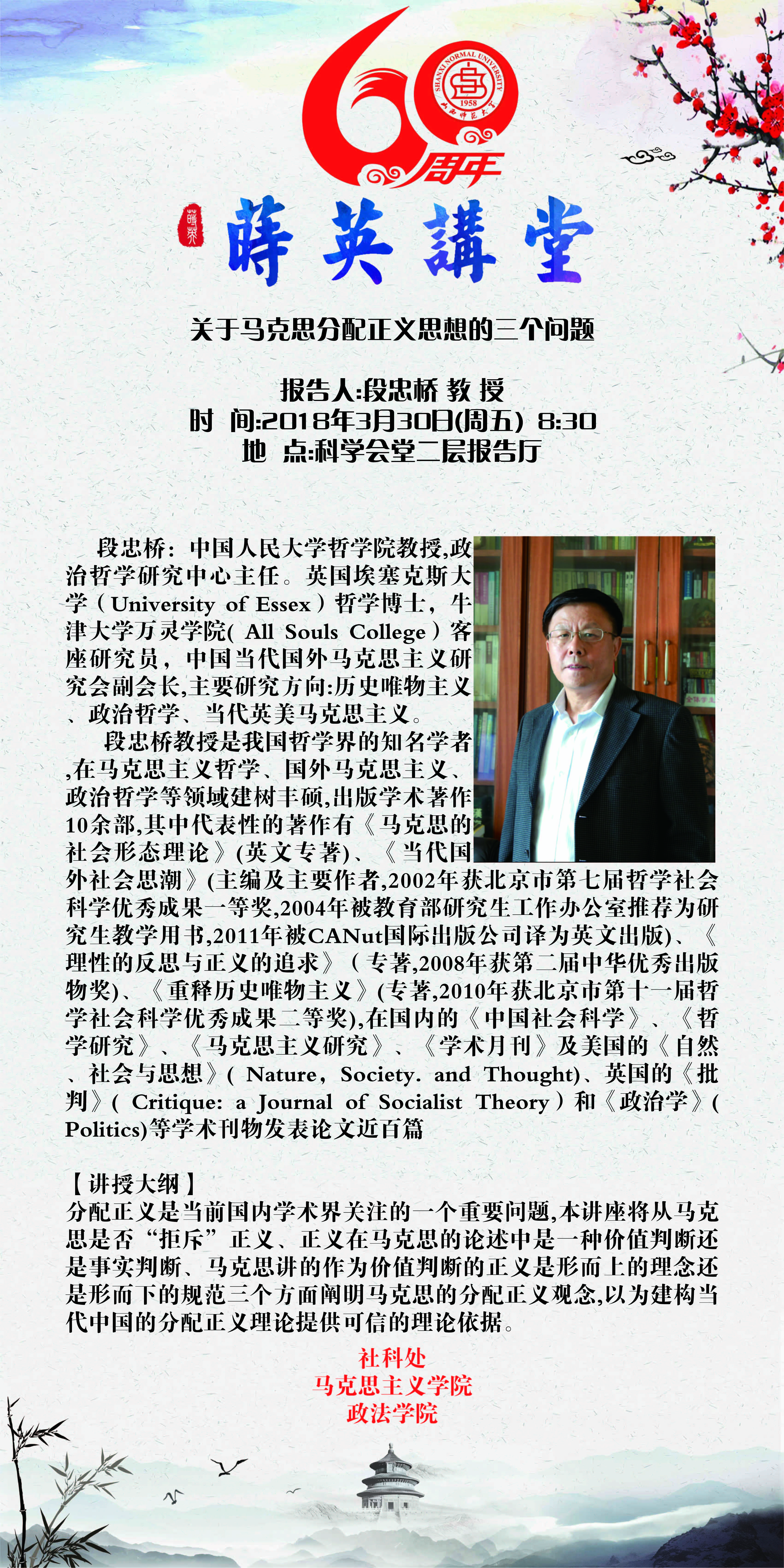 【预告】【莳英讲堂】 中国人民大学段忠桥教授应马克思主义学院、政法学院邀请来威尼斯官网作学术讲座
