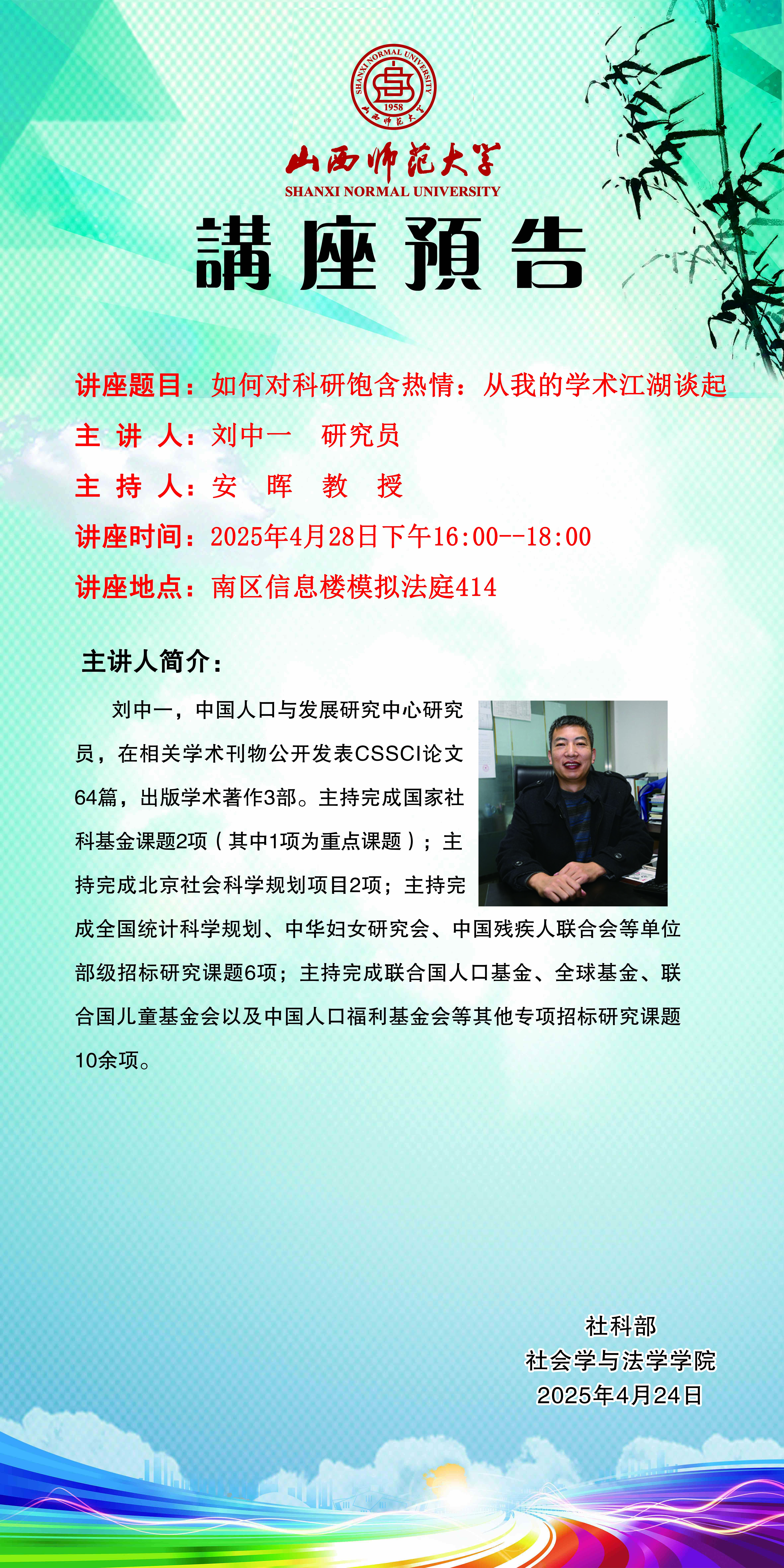 【预告】中国人口与发展研究中心刘中一研究员应威尼斯官网社会学与法学学院邀请作学术报告