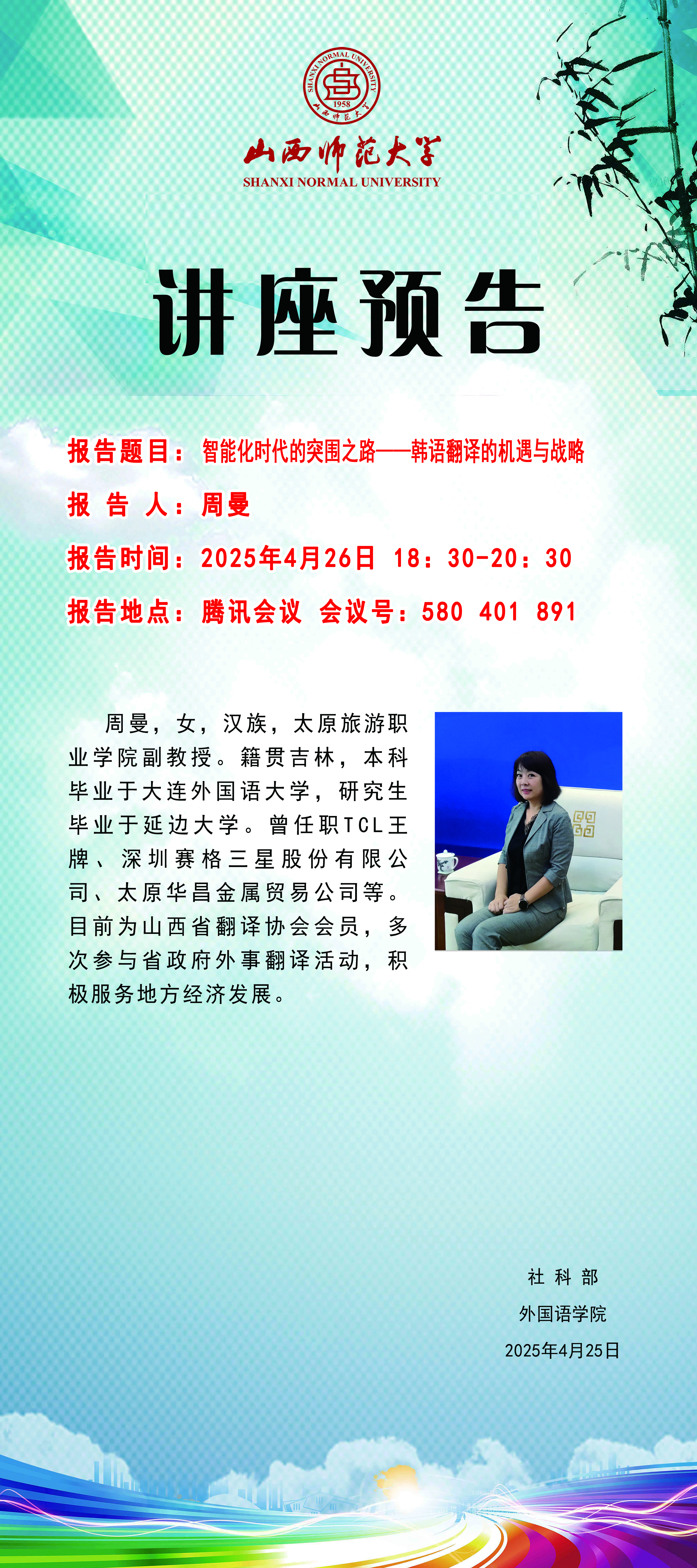 【预告】太原旅游职业学院周曼副教授应外国语学院邀请作学术报告