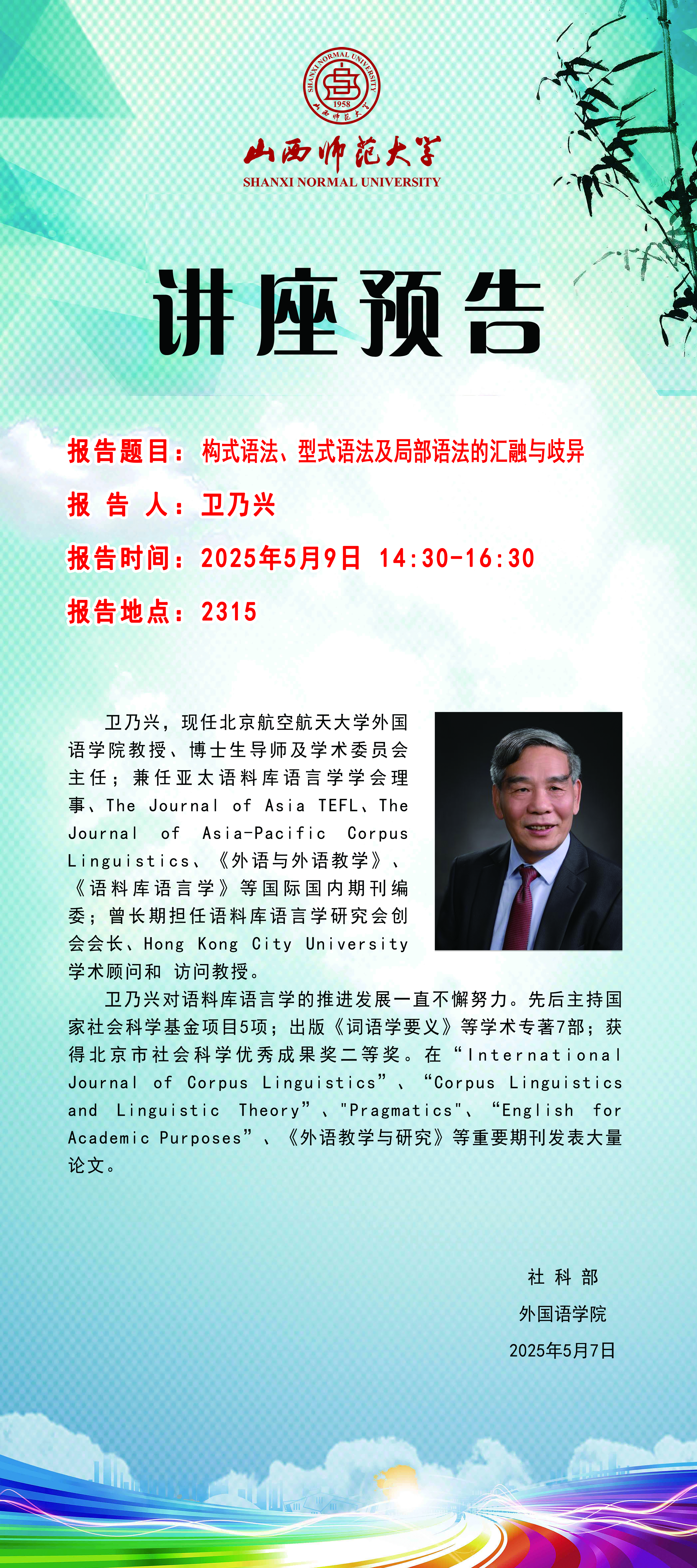【预告】北京航空航天大学外国语学院卫乃兴教授应外国语学院邀请作学术报告