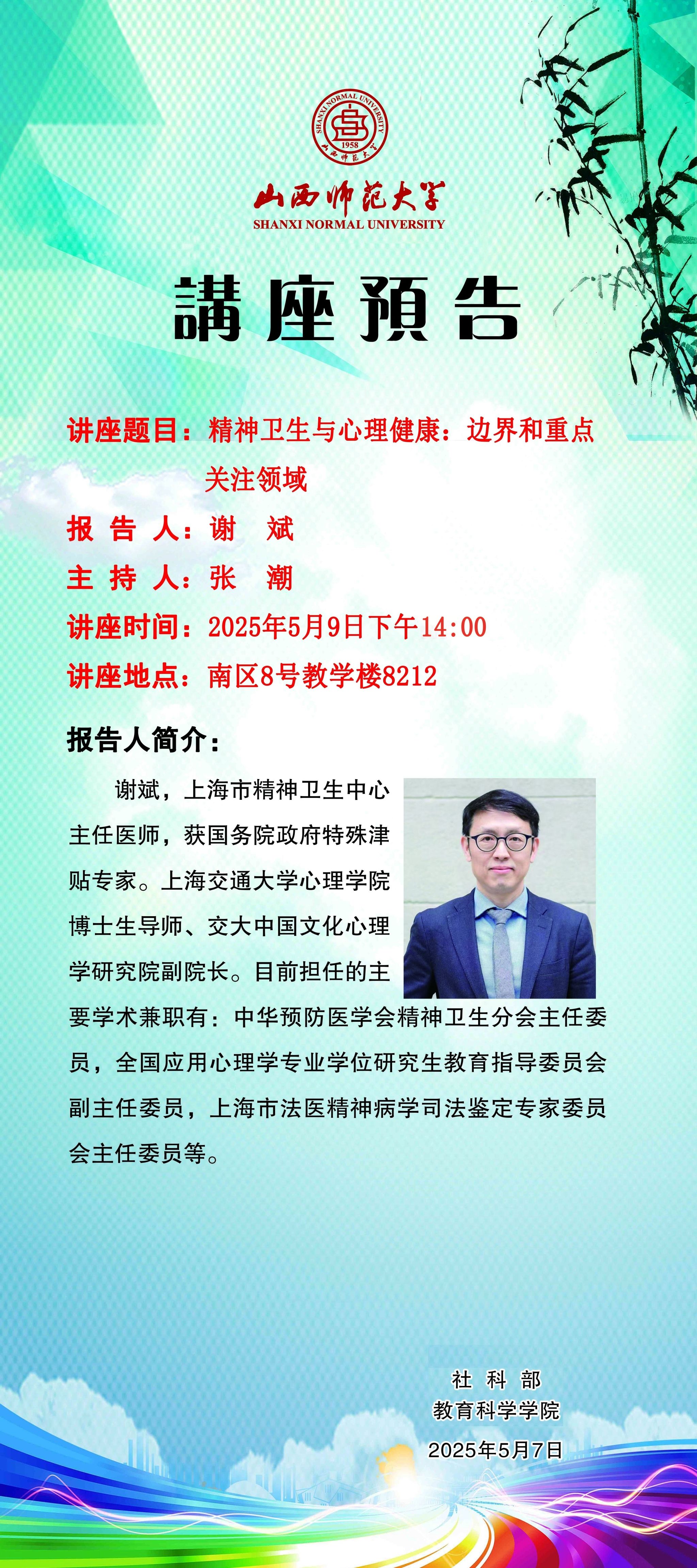 【预告】上海市精神卫生中心主任医师谢斌应教育科学学院邀请作学术报告