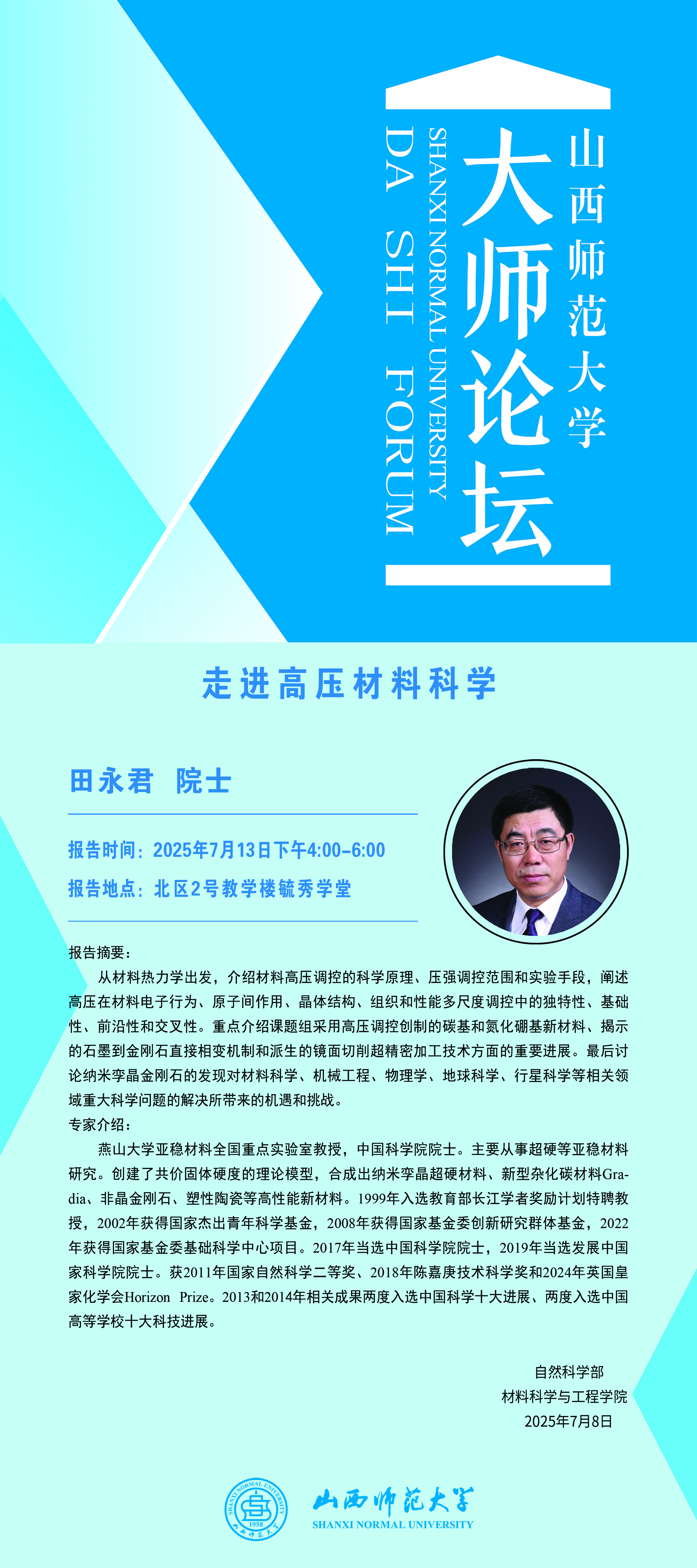 【大师论坛】燕山大学田永君院士应威尼斯官网邀请作学术报告