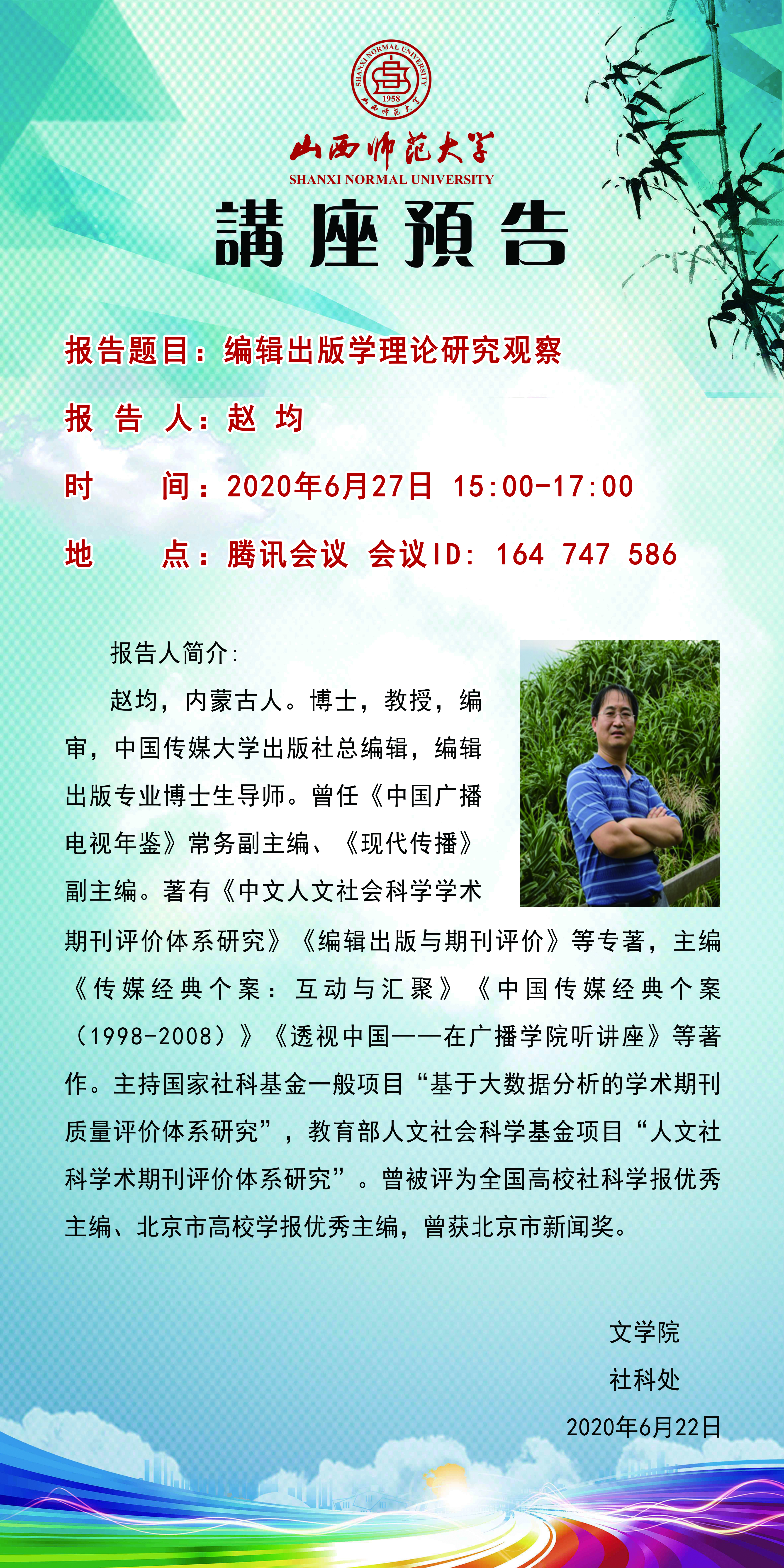 【预告】中国传媒大学赵均教授应文学院邀请举办视频直播讲座