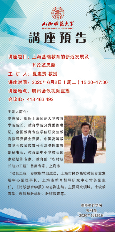 【预告】 上海师范大学夏惠贤教授应教师教育学院邀请举办视频直播讲座