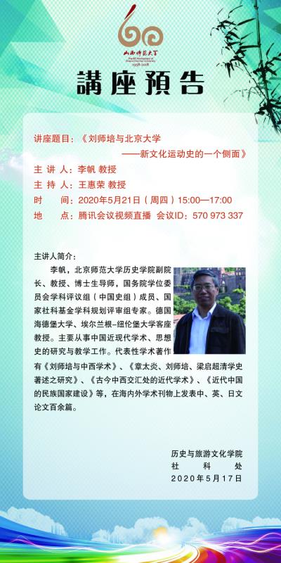 【预告】 北京师范大学李帆教授应历史与旅游文化学院邀请举办视频直播讲座