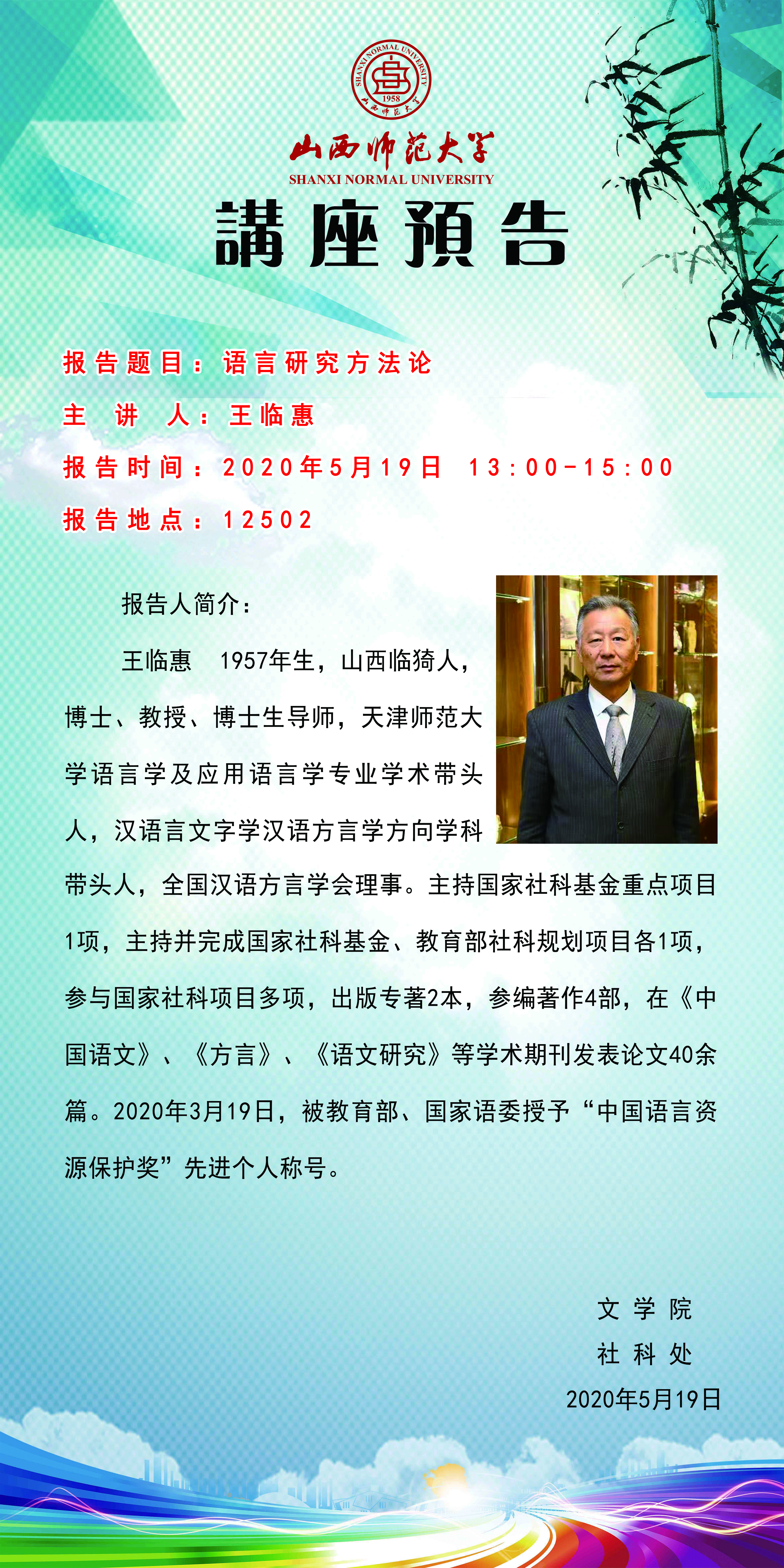 【预告】 天津师范大学王临惠教授应文学院邀请来威尼斯官网作学术报告
