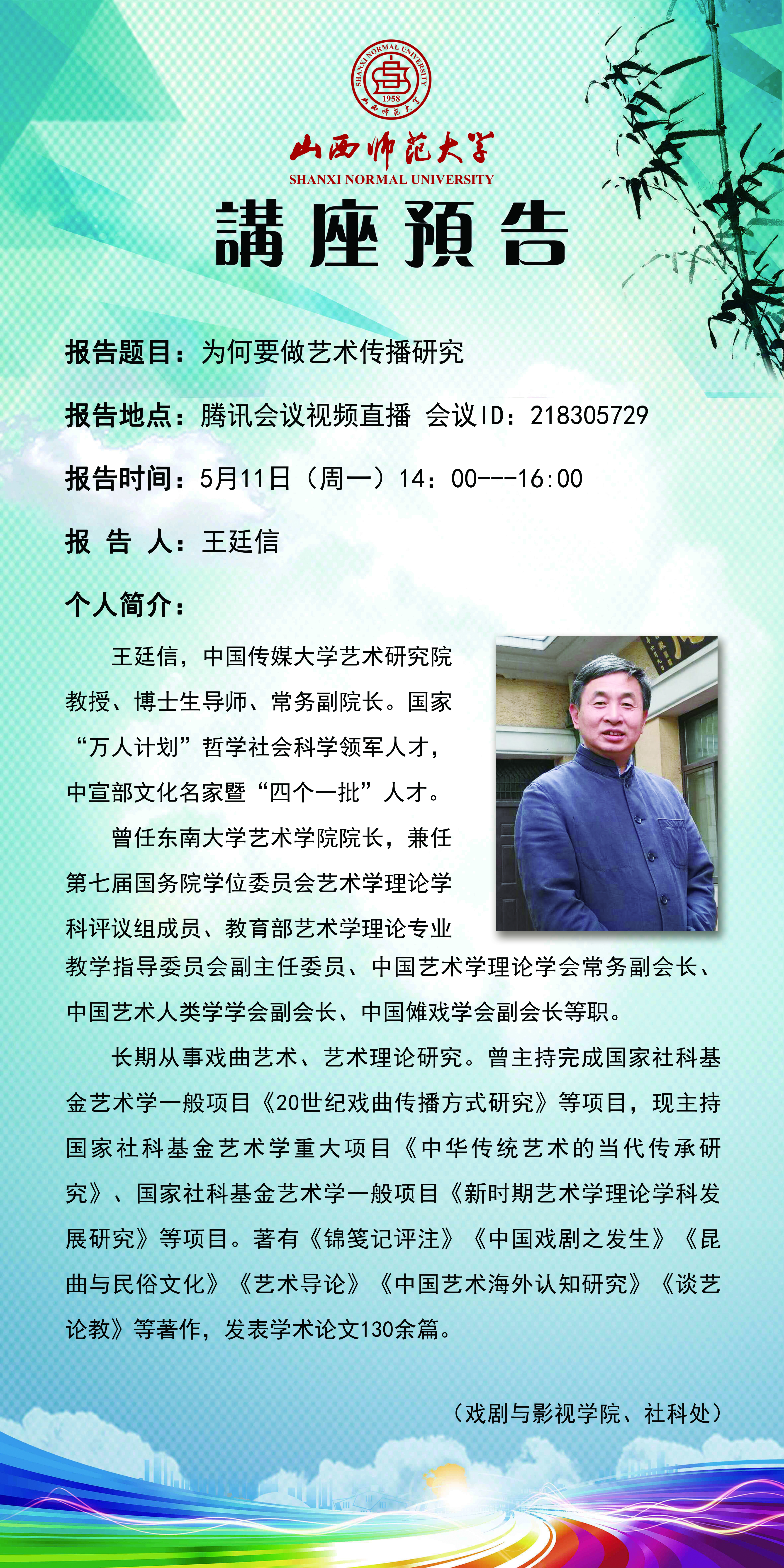 【预告】 中国传媒大学王廷信教授应戏剧与影视学院邀请举办视频直播讲座