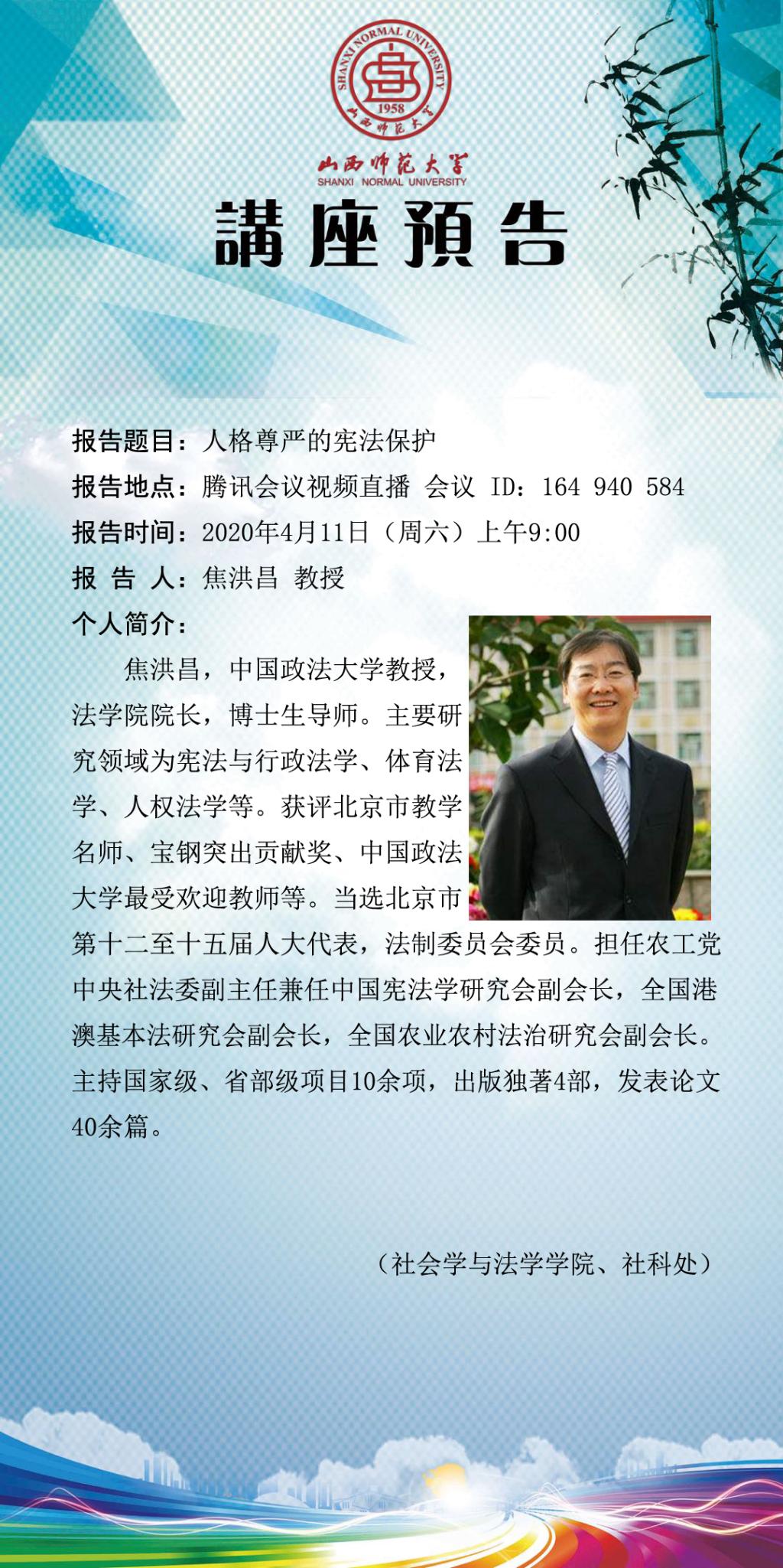 【预告】 中国政法大学焦洪昌教授应社会学与法学学院邀请举办视频直播讲座