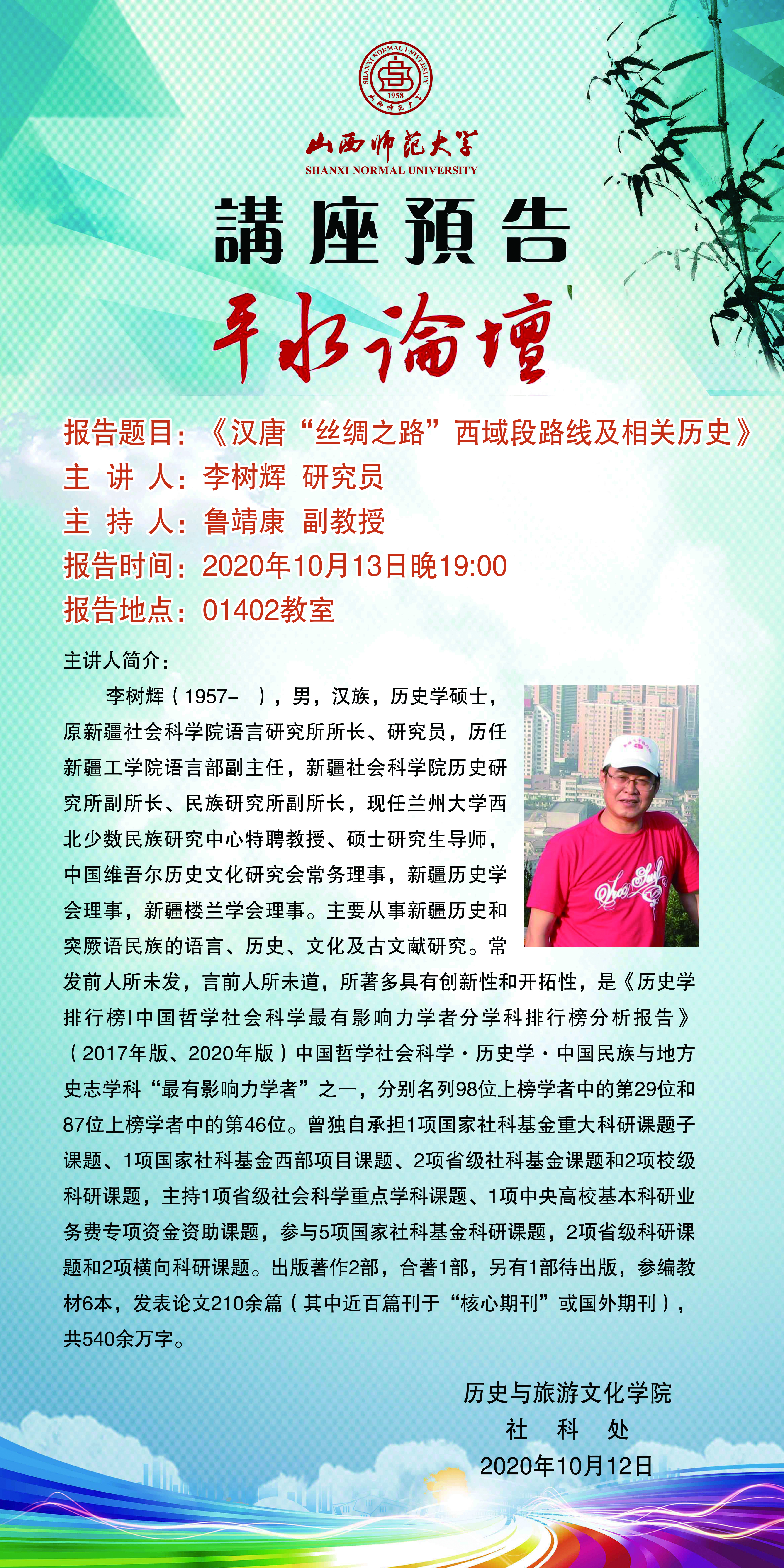 【预告】 兰州大学李树辉教授应历史与旅游文化学院邀请来威尼斯官网作学术报告
