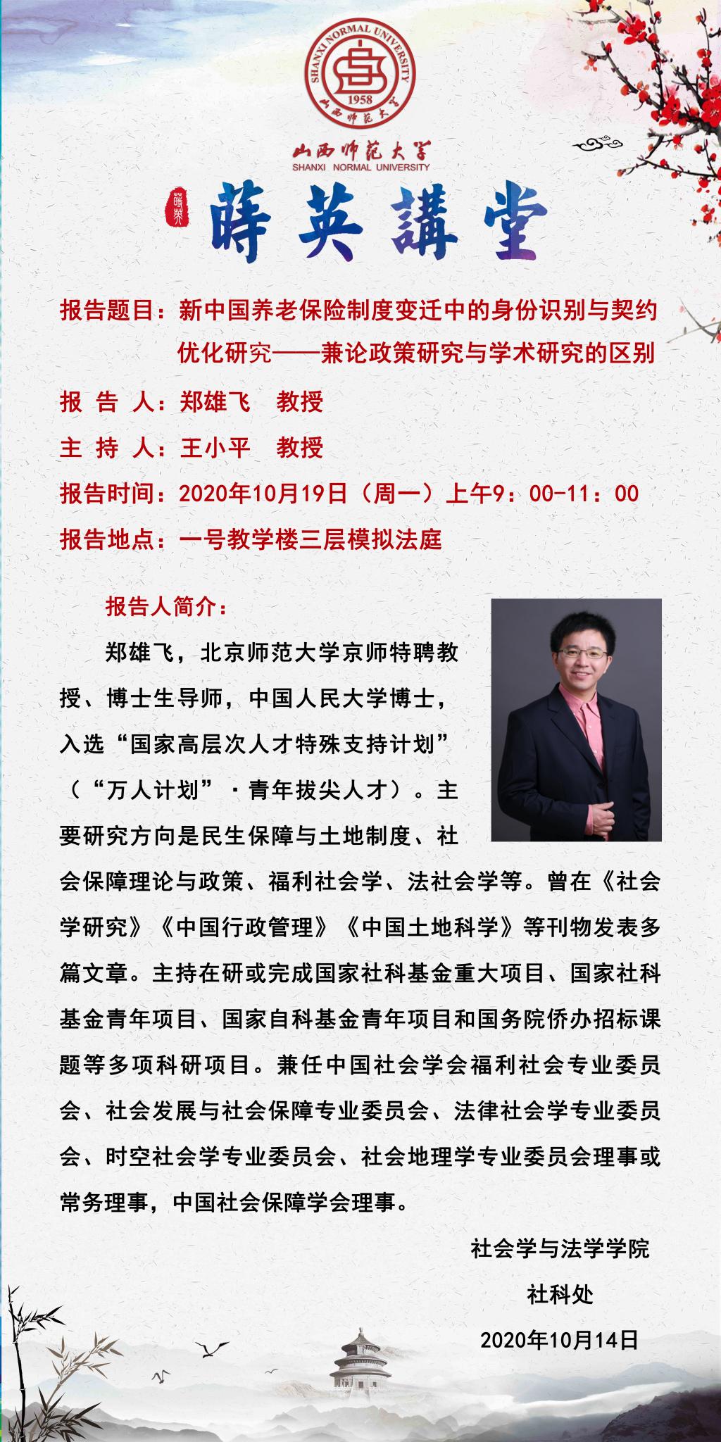 【预告】【莳英讲堂】 北京师范大学京师特聘教授郑雄飞应社会学与法学学院邀请来威尼斯官网作学术报告