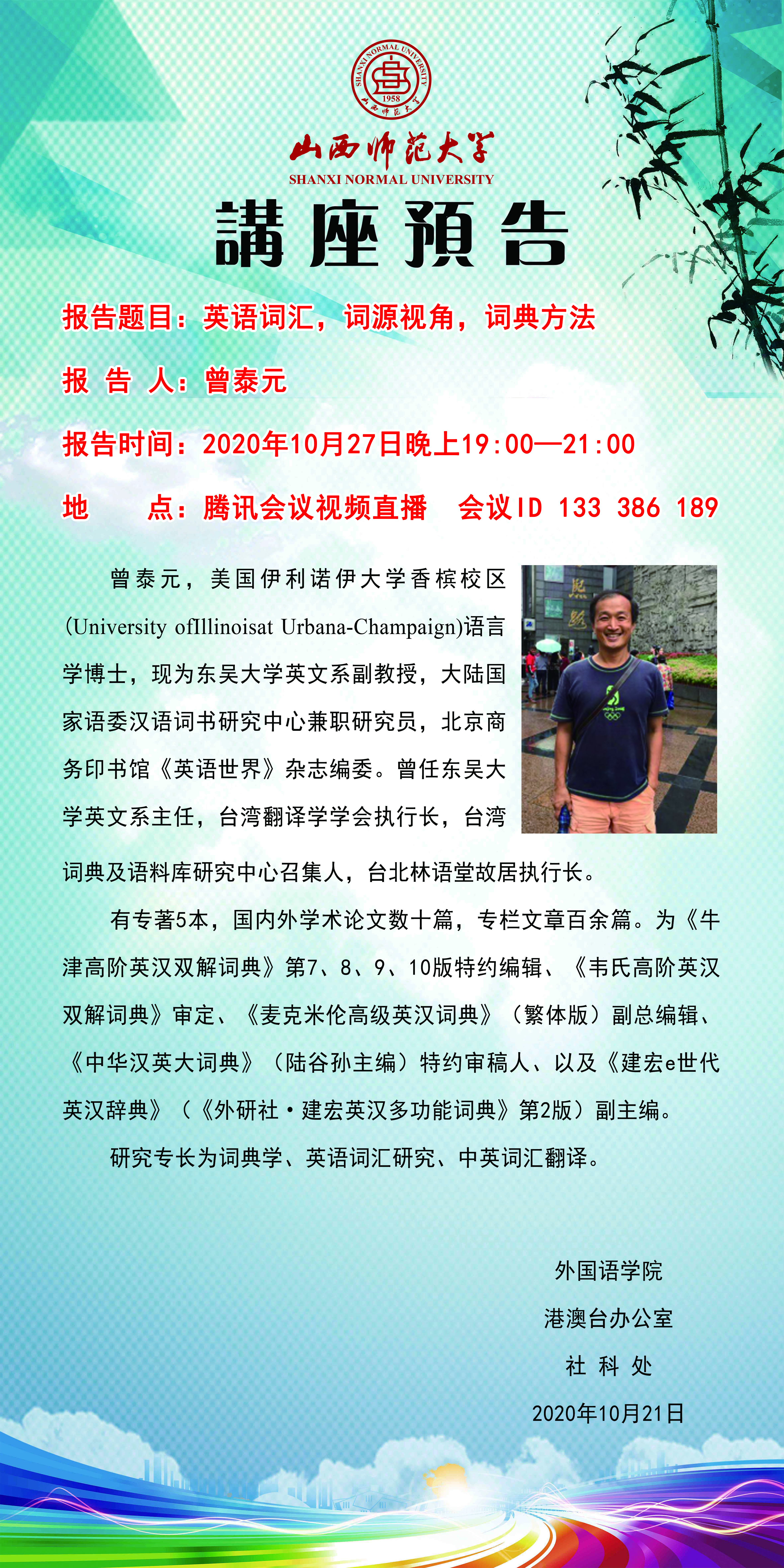 【预告】 东吴大学曾泰元副教授应外国语学院邀请作线上学术讲座