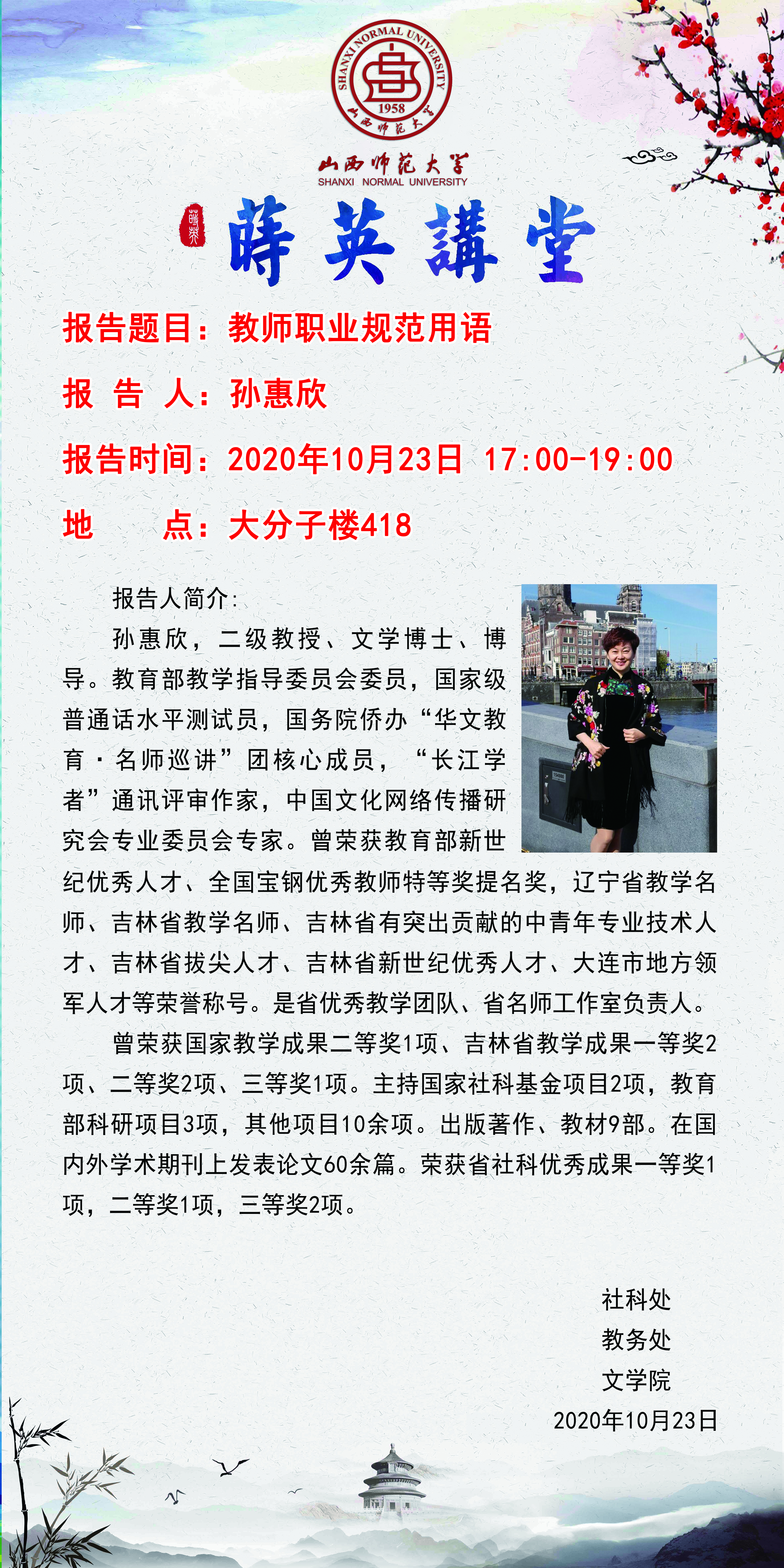 【预告】【莳英讲堂】大连大学孙惠欣教授应文学院邀请来威尼斯官网作学术报告