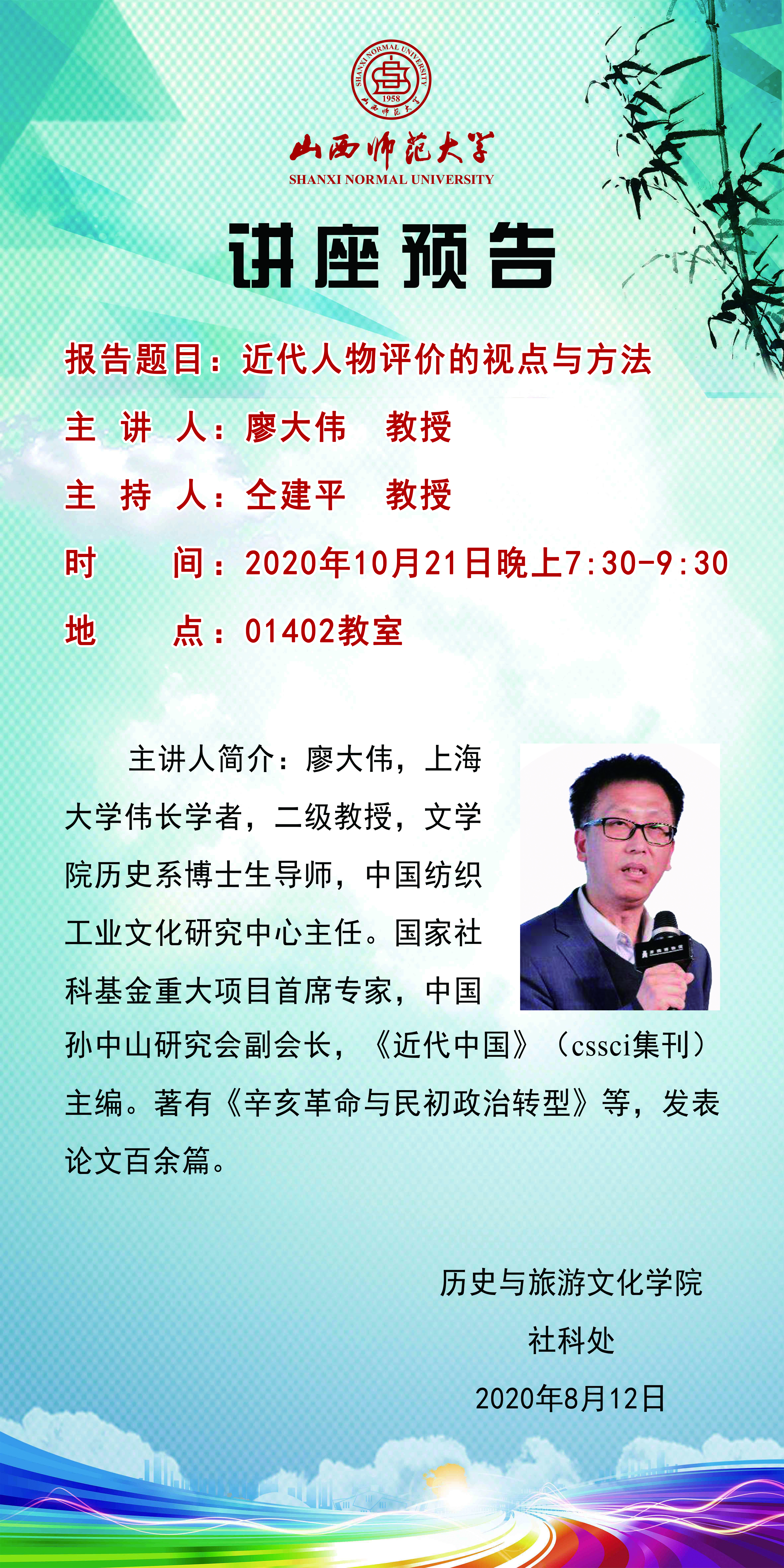 【预告】 上海师范大学廖大伟教授应历史与旅游文化学院邀请来威尼斯官网作学术报告