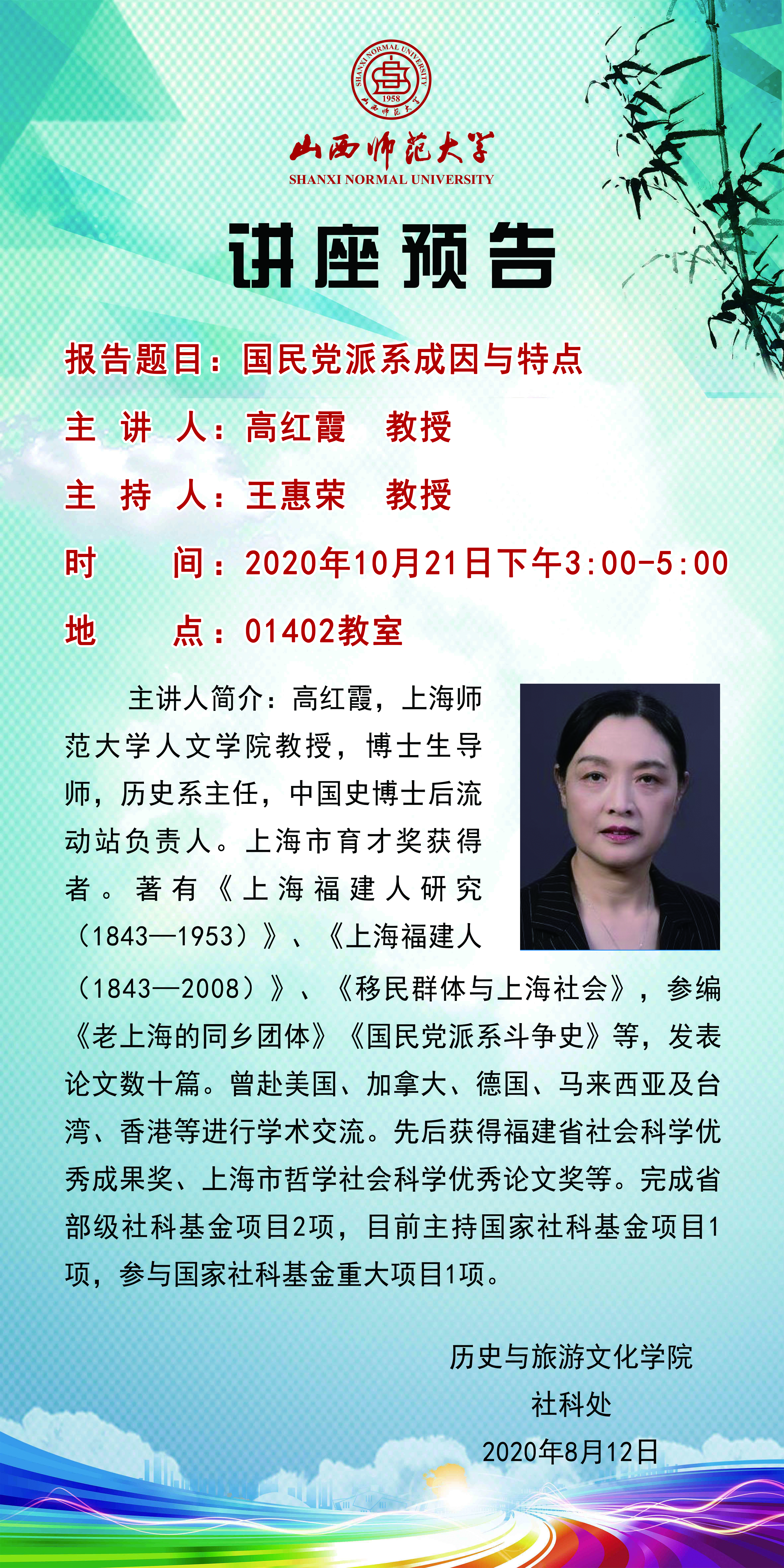 【预告】 上海师范大学高红霞教授应历史与旅游文化学院邀请来威尼斯官网作学术报告